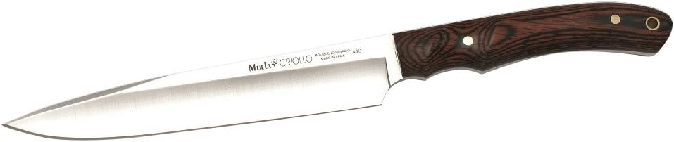 MUELA CRIOLLO-17 Hunting Knife with 6. 75 inch X50CrMov15 (1. 4116 German Stainless Steel) Plain Edge Drop Point Blade. Features an Olive Wood Handle. Overall length 11. 5 inches. Comes with Full Grain Leather Sheath and MUELA Lifetime