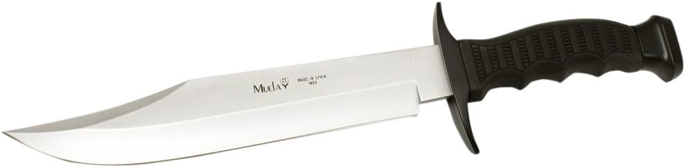 MUELA 95-221: Mountain knife: 8-5/8 inch blade, black Zamak & polymer handle, Plain edge, clip point, leather sheath
