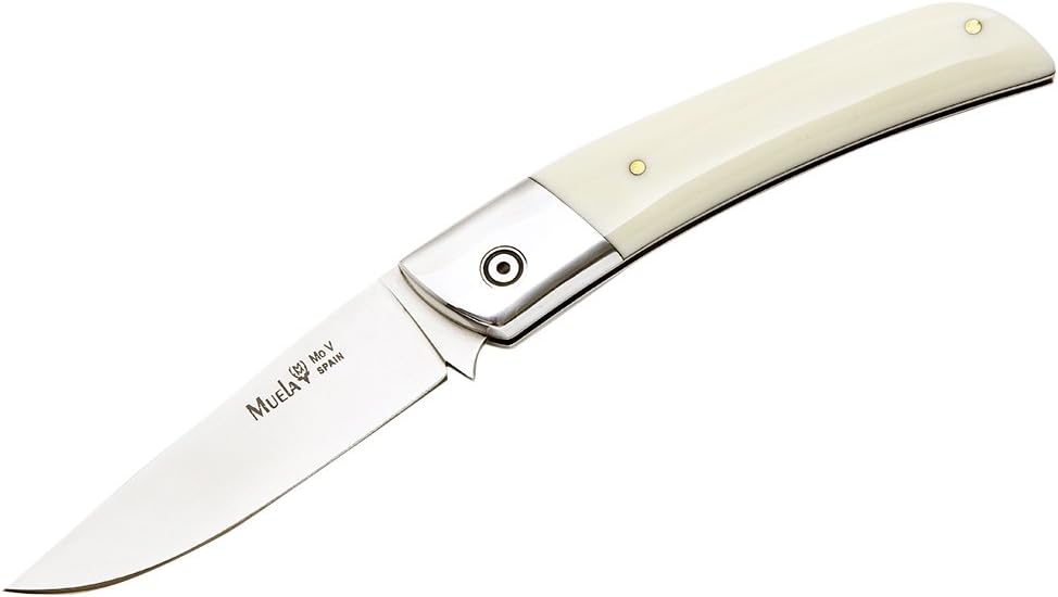 MUELA NPV-8W: X50CrMoV15 Stainless Steel 3-3/4" Blade Folding Knife, Plain Edge, Clip point, White Acrylic Ivory Handle, PVC Sheath, Boxed.