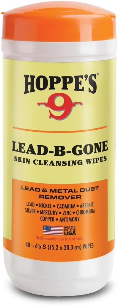 Hoppe's Lead-B-Gone Skin Cleansing Wipes are a must-have for anyone frequently exposed to metal contaminants. These wipes are designed to efficiently lift and trap a wide range of metals, including lead, nickel, cadmium, arsenic, and more. Their formulation removes up to 99.9% of contaminants with a water rinse, far surpassing the efficacy of regular soap and water. The inclusion of gentle pH cleansers and aloe skin moisturizers ensures that while your skin is cleansed of harmful metals, it remains hydrated and free from irritation. These soft towels are perfect for cleaning your hands, arms, face, and neck, as well as any working surfaces, after activities like shooting or gun cleaning. Packaged in a convenient container, the wipes are easy to carry and use on the go. They are disposable, making clean-up quick and hassle-free. Hoppe's Lead-B-Gone Skin Cleansing Wipes are an essential item for your shooting gear, offering both superior cleaning and skin protection.