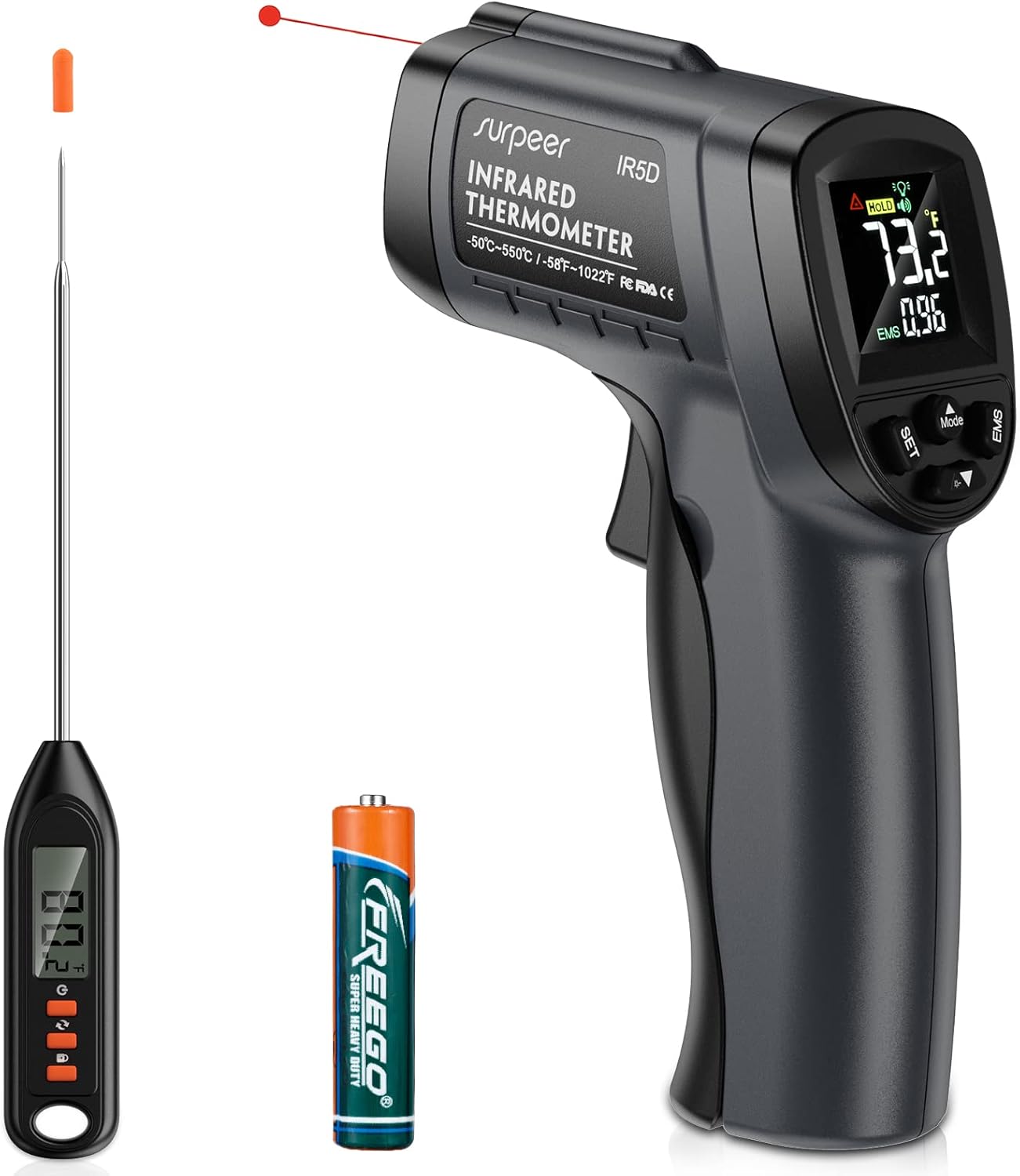 [FREE MEAT THERMOMETER]: Featuring quick reading, high accuracy (±1℃/℉), 10 minutes auto-off, long probe and 304 food grade stainless steel, it can measure inner temp of food with wide temp range -50℃~300℃(-58℉~572℉). Together with infrared thermometer, it makes the best cooking aid for food lovers and gourmets.