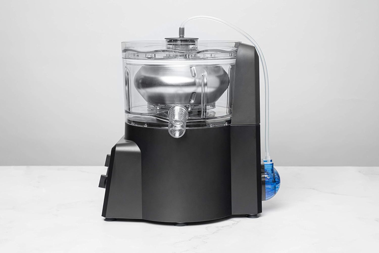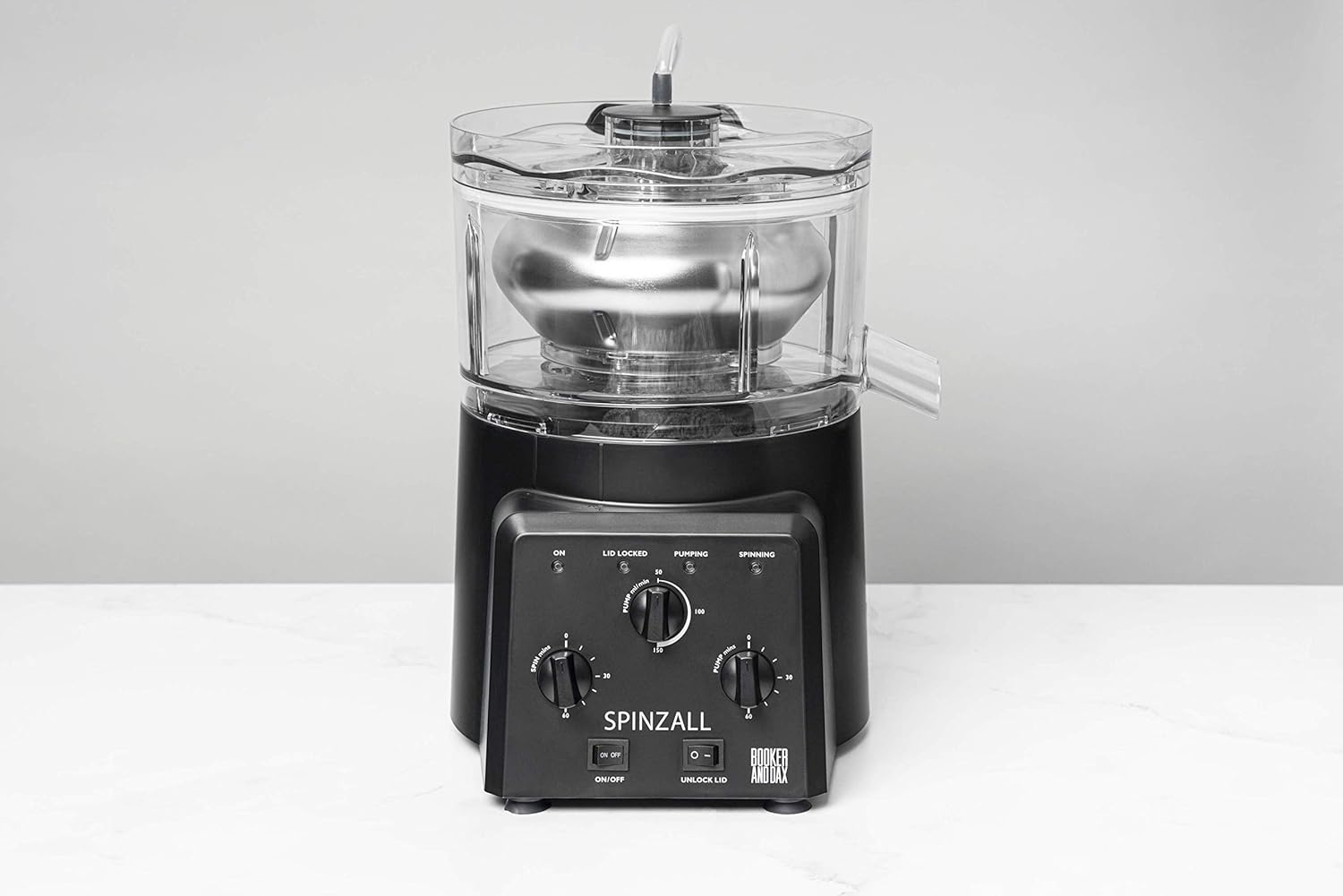 Durante varios años, los restaurantes y bares han estado utilizando centrifugadoras de laboratorio para mezclar frutas con licores, hacer aceites aromatizados, clarificar jugos, separar grasas y realizar otras hazañas culinarias. La centrífuga de laboratorio que se encuentra hoy en día en un bar o restaurante de última generación es una bestia ruidosa que pesa 200 libras y cuesta 8 000$ y es del tamaño de un aire acondicionado, y requiere un delicado equilibrio interno cada vez que se utiliza. Hasta ahora, la única alternativa más pequeña era una minicentrífuga, que costaba unos cientos de dólares, pero que, en las mejores circunstancias, tenía un rendimiento minúsculo de 100 mililitros. La Spinzall es la primera centrífuga diseñada para resolver estos problemas y ser sencilla y amigable para su uso culinario. Se equilibra automáticamente y tiene una forma de rotor especial que permite clarificar a velocidades más bajas y seguras que las centrífugas industriales más grandes. La Spinzall consta de un único rotor de 500 ml, de acero inoxidable y resina Tritan, de cubeta abierta, alojado dentro de una carcasa de resina Tritan. El Tritan es un plástico resistente a los golpes y sin BPA que se utiliza en las jarras de batidoras de gama alta. En el interior del rotor hay tres aletas extraíbles que ayudan al rotor a mantener el equilibrio al girar, pero se pueden quitar fácilmente para limpiar y recoger los productos del rotor. La carcasa contiene un mecanismo de enclavamiento, por lo que la tapa del Spinzall no se puede abrir mientras el rotor está girando. El rotor, las aletas, la carcasa y la tapa se pueden lavar en el lavavajillas. El Spinzall utiliza un motor de inducción de corriente alterna de larga duración y funcionamiento silencioso que no requiere mantenimiento ni cambios de cepillo. La velocidad del rotor oscila suavemente entre 4100 y 3650 rpm. Esta oscilación ayuda a distribuir los sólidos de manera uniforme alrededor del rotor. La base del motor Spinzall contiene una bomba de líquido de velocidad variable que se puede utilizar para bombear líquido de forma continua al rotor mientras gira, lo que permite hacer girar más de 500 ml de producto sin detener el Spinzall.
