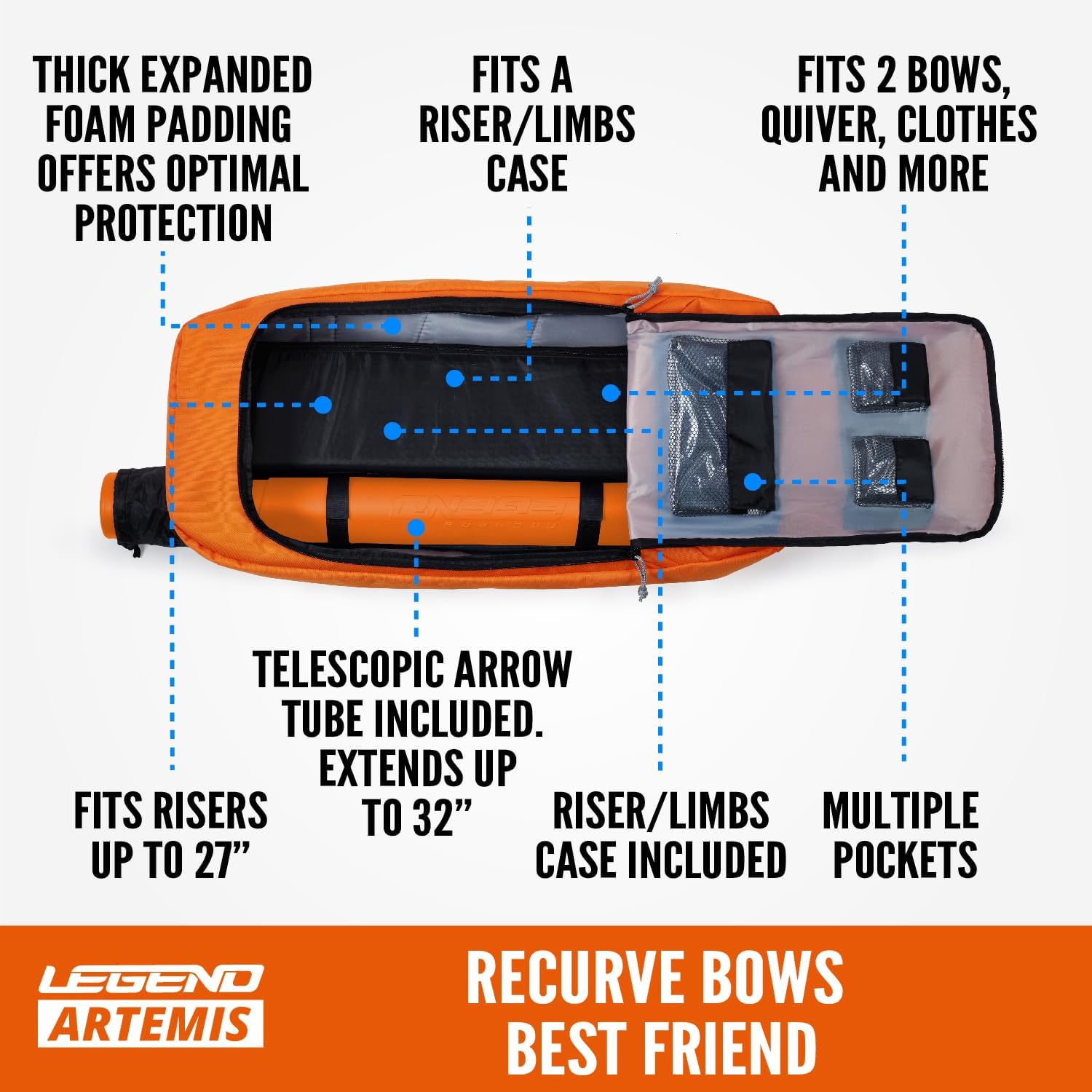 STORAGE; With plenty of pockets for your archery accessories, the LEGEND Artemis recurve bag neatly fits everything you need in one place; It can even fit the included telescopic arrow case that extends up to 32 inches, as well as risers up to 27”