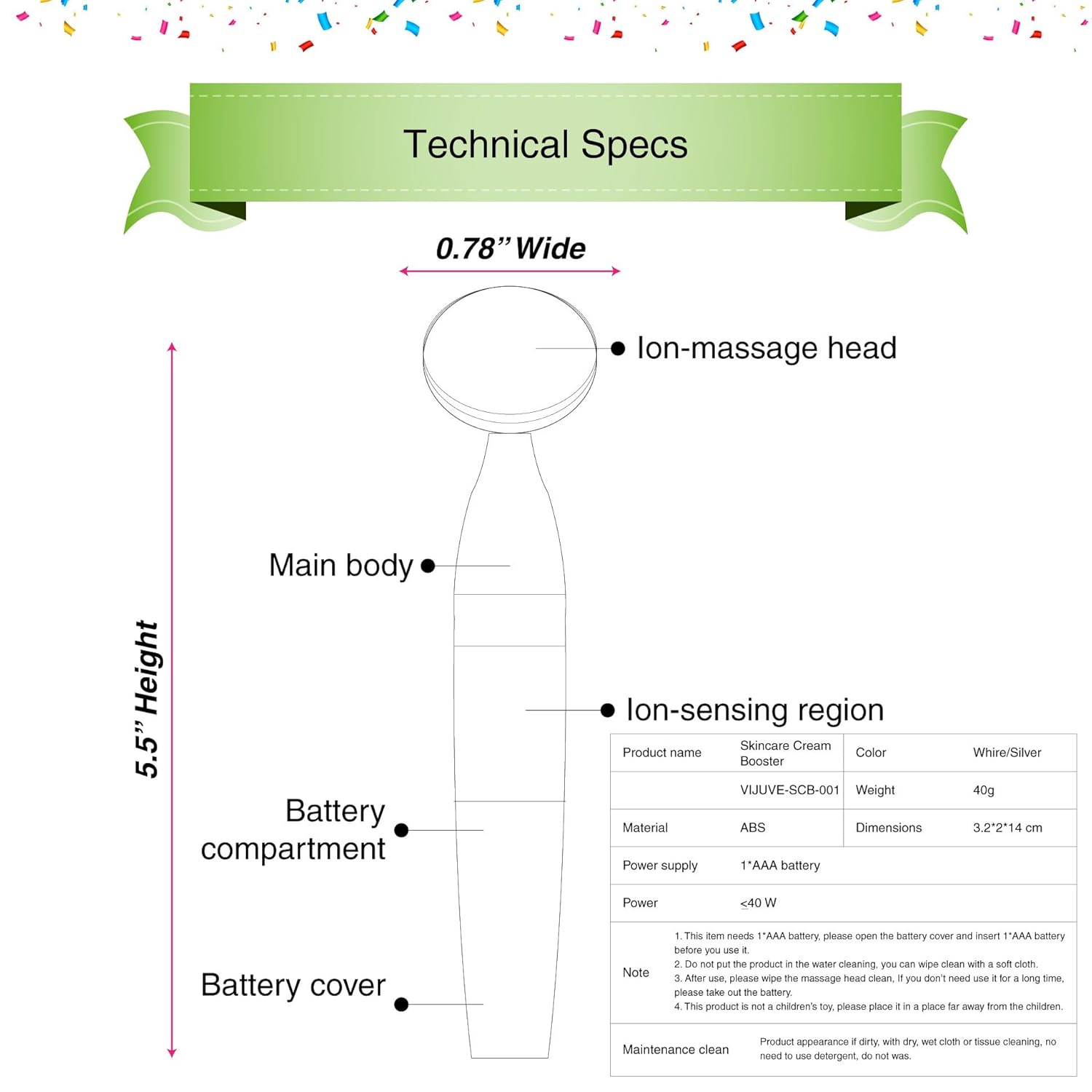 BREAKTHROUGH TECHNOLOGY & PORTABILITY; A revolutionary face cream, serum and lotion boosting device which offers NO CHARGING feature; Works for 2-3 weeks on a single AAA battery; Isn’t it amazing? You’re welcome; And the sleek 5 inches long design and the 1.8 ounces lightweight makes cream boosting tool truly portable