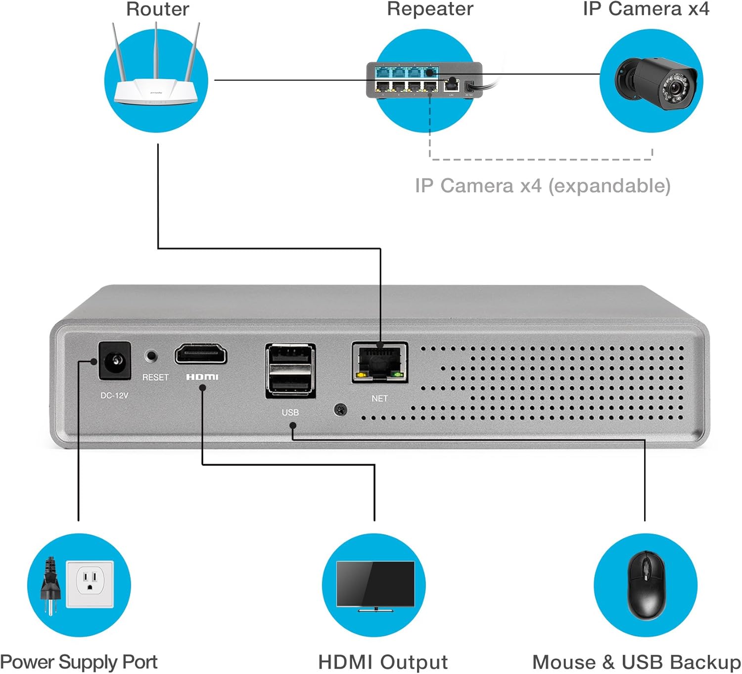 【Simplified PoE】- Simplified Power over Ethernet means the IP cameras connect to the NVR with a single cable that transmits both data and power, allowing for an easy installation and setup. Repeater fits your flexible installation need. 8 Channel NVR gives you choices to add up to 4 more wired or wireless Zmodo Cameras