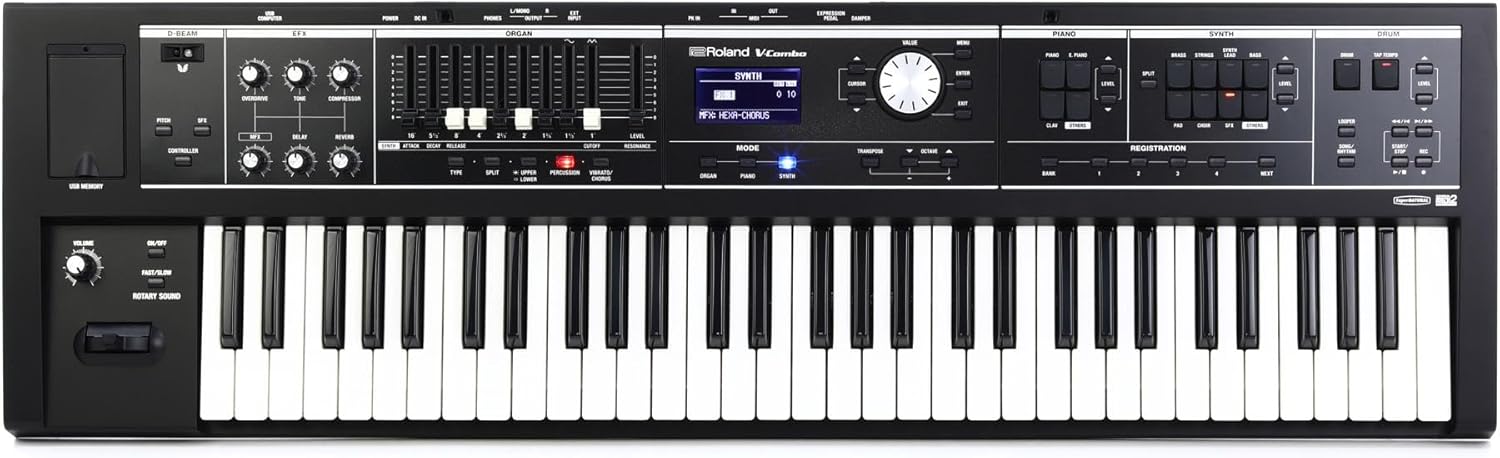 Lightweight, affordable, and outfitted with top-level Roland sounds, the V-Combo VR-09-B is the ideal all-in-one solution for performing keyboard players. Dedicated organ, acoustic/electric piano, and synth engines are organized in three sections on the front panel, providing fingertip access to the essential tones you need for covering any music style. Powerful real-time controls give you maximum expression on stage, with hands-on sliders for tone shaping and a large array of knobs and buttons for tweaking the seven simultaneous effects and numerous other parameters. With its versatile sounds, smart user interface, and highly mobile design, the V-Combo VR-09-B is a dream come true for gigging musicians.