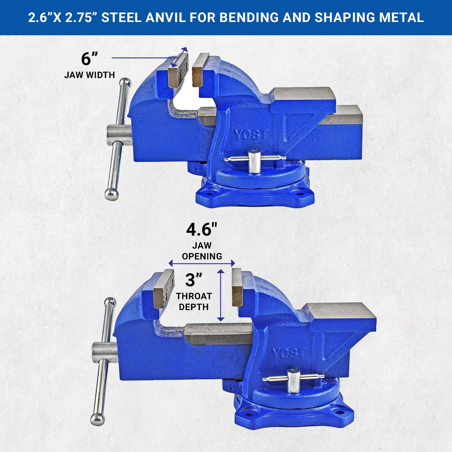 MULTI PURPOSE BENCH VISE: The Yost BV-6 bench vise is an essential home workshop accessory. Made from 30,000 psi iron castings, a durable scratch resistant blue powder coating design, and a capable 6 inch jaw width this will meet the needs of any home diy workshop looking to clamp down some metal, woodwork, pipe, tubing, plastic or similar.