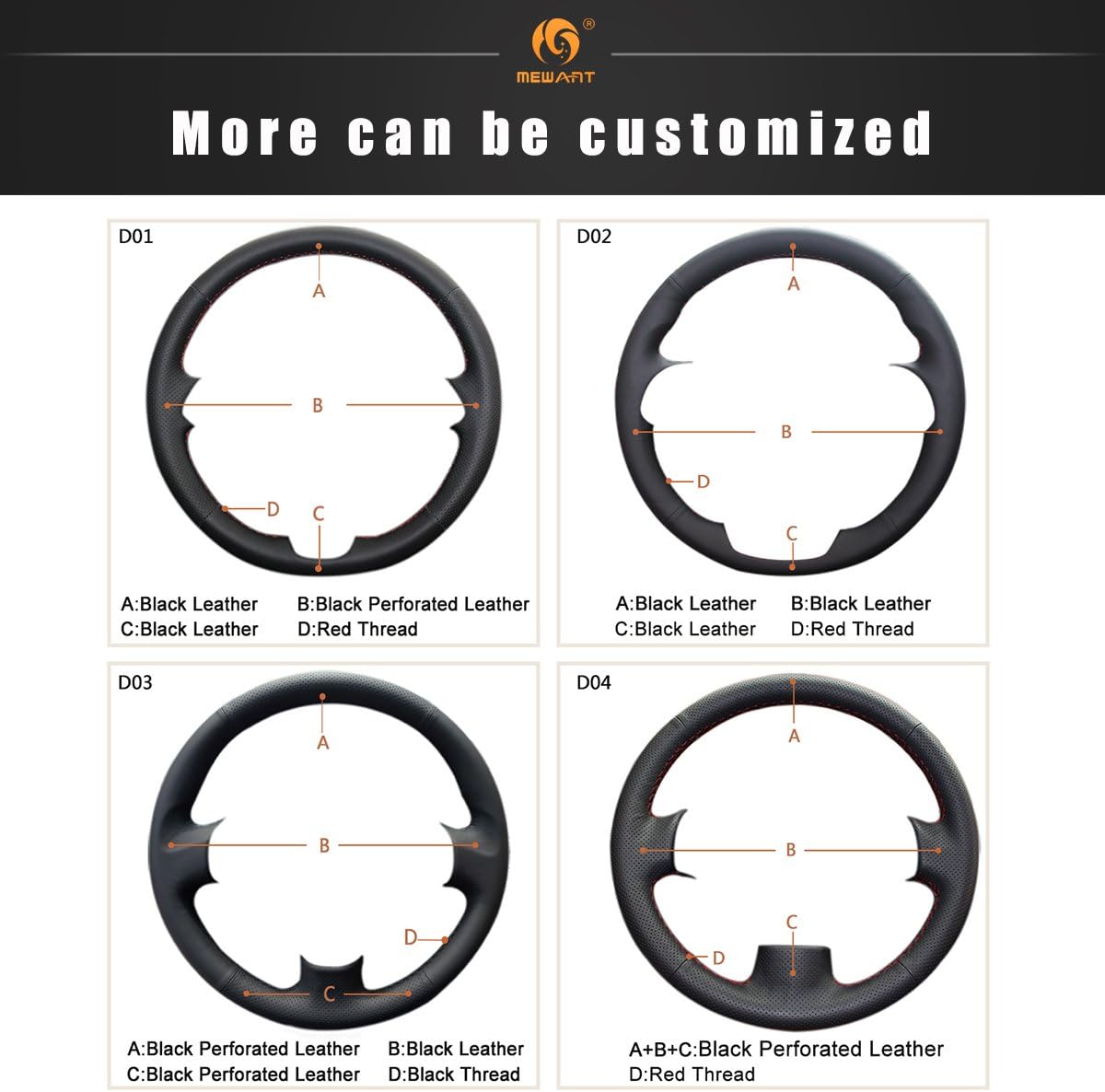 ★ Customization: Mewant customized cover 100% perfectly fit your steering wheel, precise fit just like the OEM. If you need to custom, please tell us your favorite cover style before you place order. (For each cover style you can also choose different leather and thread color in each parts of cover style.)