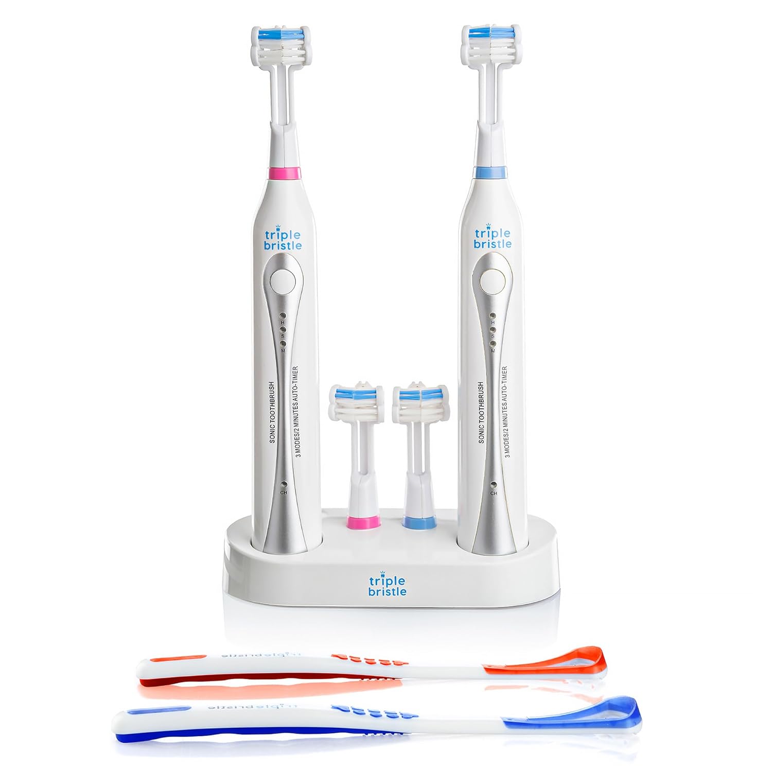 TRIPLE BRISTLE DUO - Our rechargeable three sided toothbrush adult pair has a patented 3-sided brush head and was created with TWO in mind. The Triple head toothbrush was scientifically designed with 31,000 sonic stroke vibrations per minute to give your teeth the best possible clean in 1/3 the time of an ordinary sonic toothbrush.