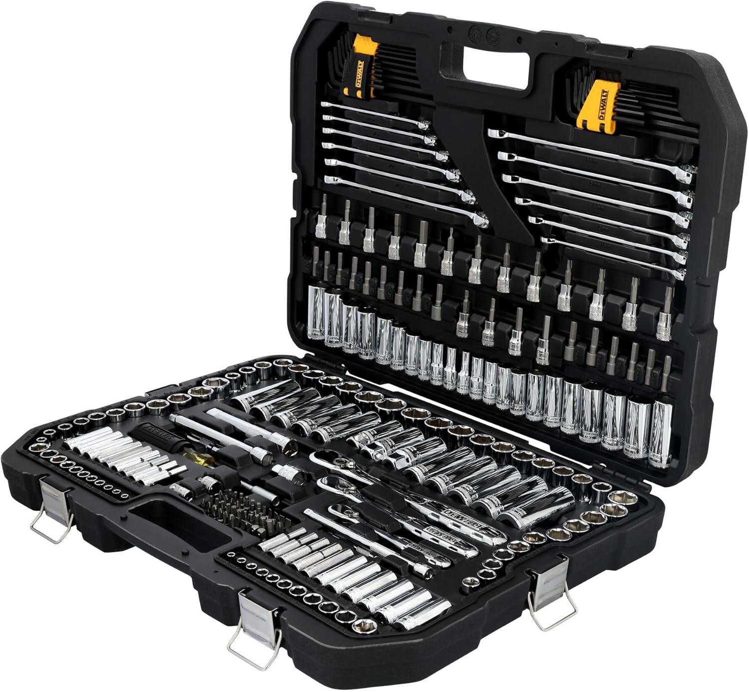 Conjunto de herramientas mecánicas DEWALT, 247 piezas, 1/4 in., 3/8 in. y 1/2 in. de tornillo, SAE, trinquetes, llaves roscadas, llaves hexagonales, llaves combinadas, acabado cromado pulido (DWMT81535)