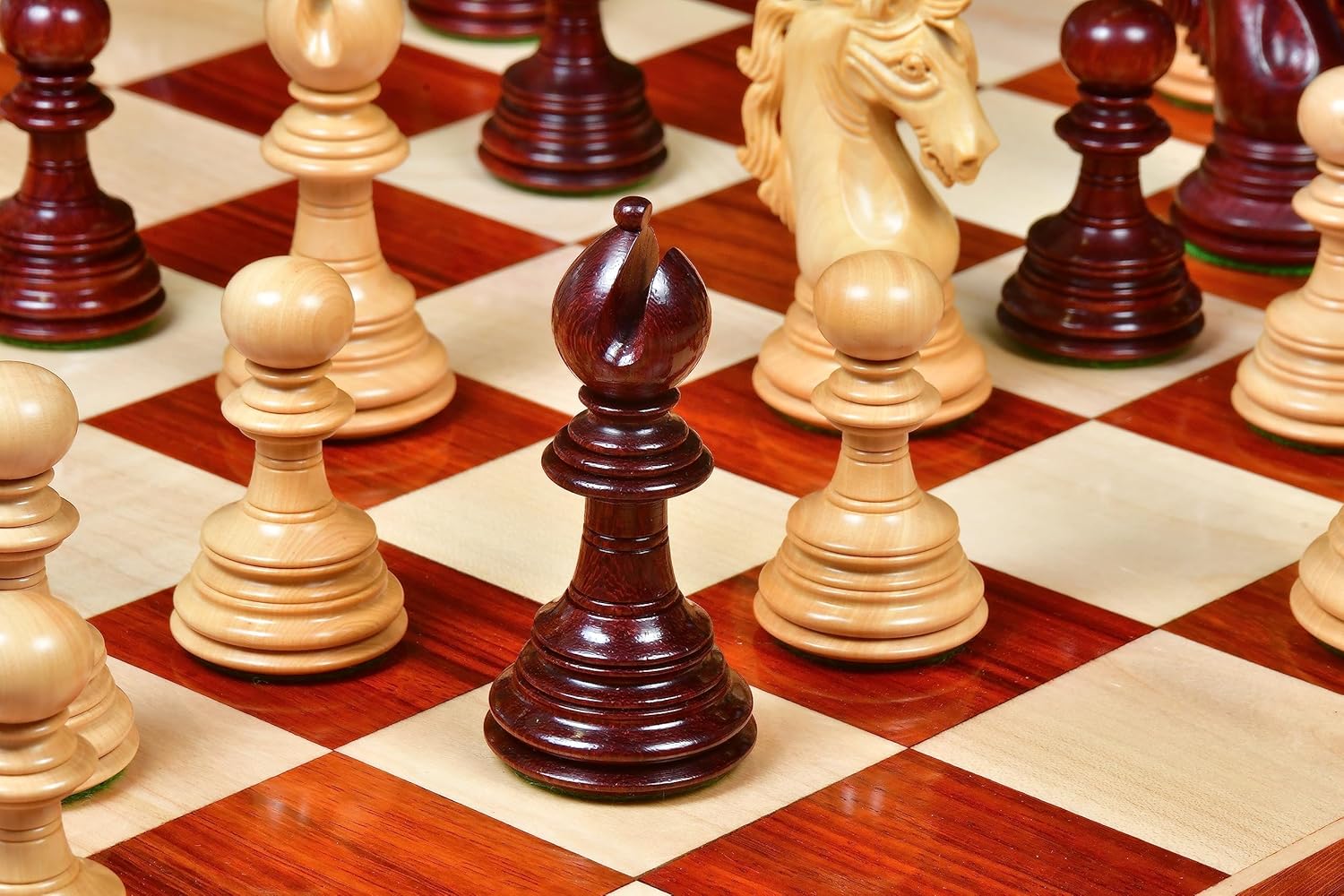 Las piezas de ajedrez American Adios están hechas de madera de rosa bud y madera de cajón. El rey mide 4.4" de alto. El juego de ajedrez viene con 34 piezas, incluyendo 2 reinas extra. Este juego es Triple Pesado y las piezas de ajedrez tienen una gruesa base de fieltro verde. Diseño y Calidad: Pesadas adecuadamente, estas piezas son muy estables en el tablero y un placer tocarlas y sentirlas. Cada pieza está meticulosamente tallada y pulida a mano para darle un brillo rico y duradero. El diseño, la calidad y la artesanía de estas piezas de ajedrez son inigualables. Sobre el Tablero Este hermoso tablero está hecho de madera de rosa bud en el lado más oscuro y madera de cajón en el lado más claro. Esta venta es solo para el Tablero de Ajedrez y las piezas NO están INCLUIDAS con el juego. El tamaño del Tablero es (23" x 23") / (58.4 cm x 58.4 cm) con un tamaño de cuadrado de (2.4" x 2.4") / (60 mm x 60 mm). El Tablero tiene un grosor de 22 mm. El peso del Tablero de Ajedrez es de 5500 gramos (194 oz).