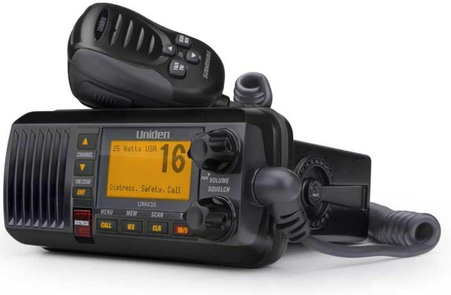 UM435 fixed mount VHF radio - Black Features: front panel designed Canadian Marine broadcast “B” channels International 4 digit Channelsipx8/ JIS8 submersiblekeys on mic.  16/09, ch up/down, Scan/memlarger LCD 25mm x 51Mmnmea 0183 in/Out full dot matrix display with easy-to-use intuitive menusuniden 25 watt full-featured fixed mount VHF marine radio Designed with a shorter chassis for more versatile installations.1 watt/25 watt transmit powerful (digital Selective calling)one receiver dedicated for channel 70 disc callsdistress, individual, urgency, safety, position report and send, DSC test call and menu selection for auto DSC channel switching triple watch plus Ultra compact rugged construction durable rubber grip mics.A.M.E. Emergency/weather alertchannel namesbacklit LCD display and keypad LCD display and dimmer triple watch plus memory scan & weather scan/compatible with Uniden mrn-gpsk GPS receiver