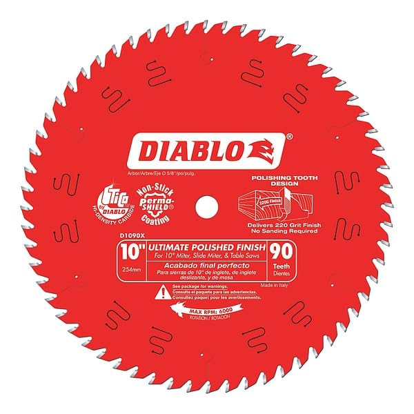 La sierra Diablo de 10 pulgadas x 90 dientes de acabado perfecto funciona con sierras de corte/escuadra y mesa. Cuenta con una hoja de carburo de alta densidad TiCo y diseño de kerf ultra delgado para cortar madera fácilmente. Los puntos de corte de precisión proporcionan acabados perfectos. El recubrimiento antiadherente Perma-Shield ayuda a proteger la hoja del calor, la acumulación y la corrosión. Carburo de alta densidad TiCo para aumentar el rendimiento y la vida máxima de corte Para uso con sierras de corte/escuadra o mesa Recubrimiento antiadherente Perma-SHIELD para protección contra el calor, la acumulación y la corrosión Diseño de kerf ultra delgado para cortes fáciles Diseño de muesca de corte y reducción del consumo de amperios para menos desperdicio de material y máximo rendimiento de la herramienta Tipo de producto de herramientas: Herramienta eléctrica Familia de color: Rojo Tamaño del vástago: 5/8 pulgadas Número de dientes: 90 Material de corte: Madera Número en el paquete: 1 Material de la hoja de sierra: Carburo Tipo de accesorio de herramienta eléctrica: Sierra circular Diámetro de la hoja de sierra (pulgadas): 10 Profundidad del producto (pulgadas): 0.25 Altura del producto (pulgadas): 14 Ancho del producto (pulgadas): 12 Ancho de envío: 8 Altura de envío: 10 Longitud de envío: 12