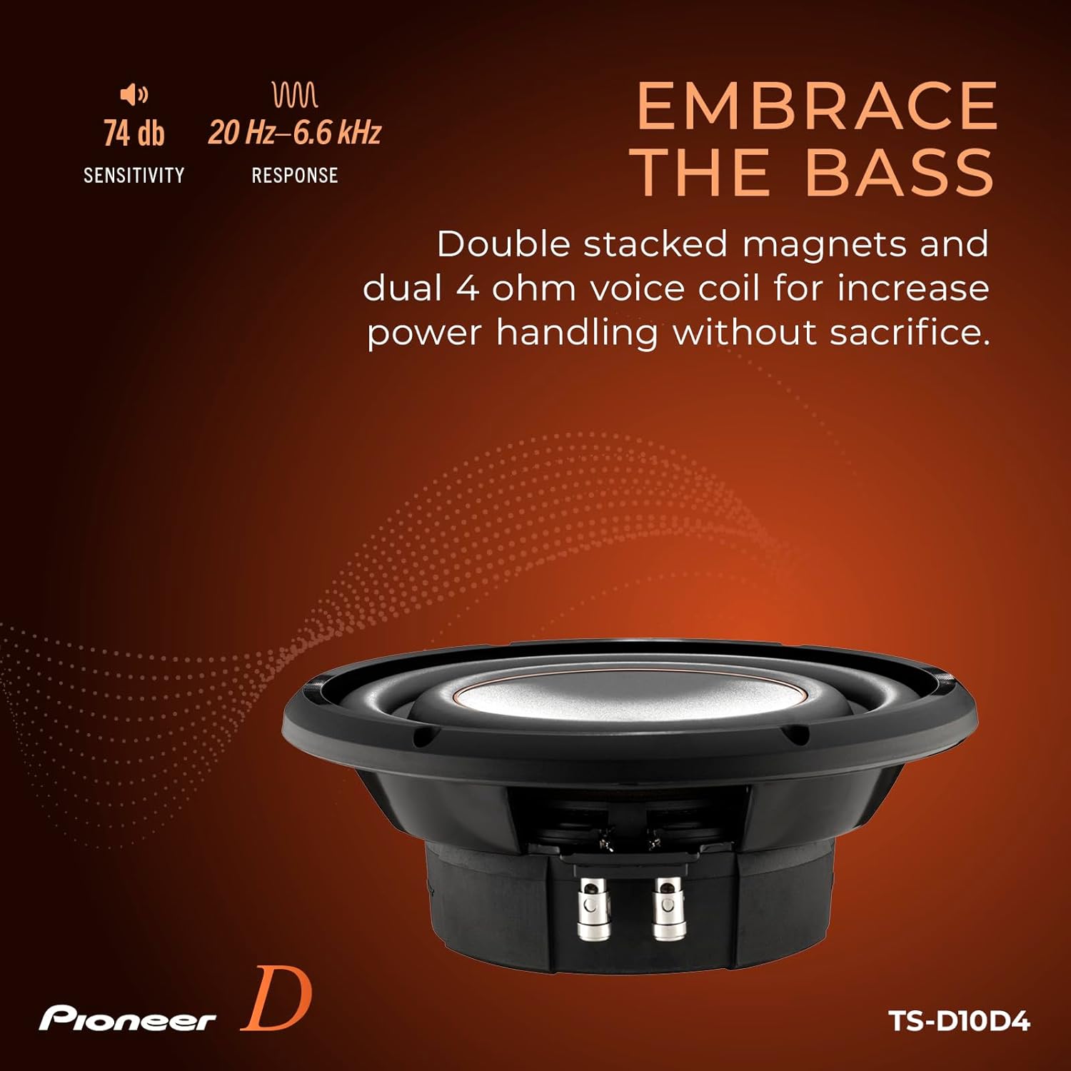 Pioneer D-Series TS-D10D4 10” High Performance Subwoofer – 1300W Max, Dual 4 Ohm Voice Coil for Flexible Wiring, Powerful Bass Output