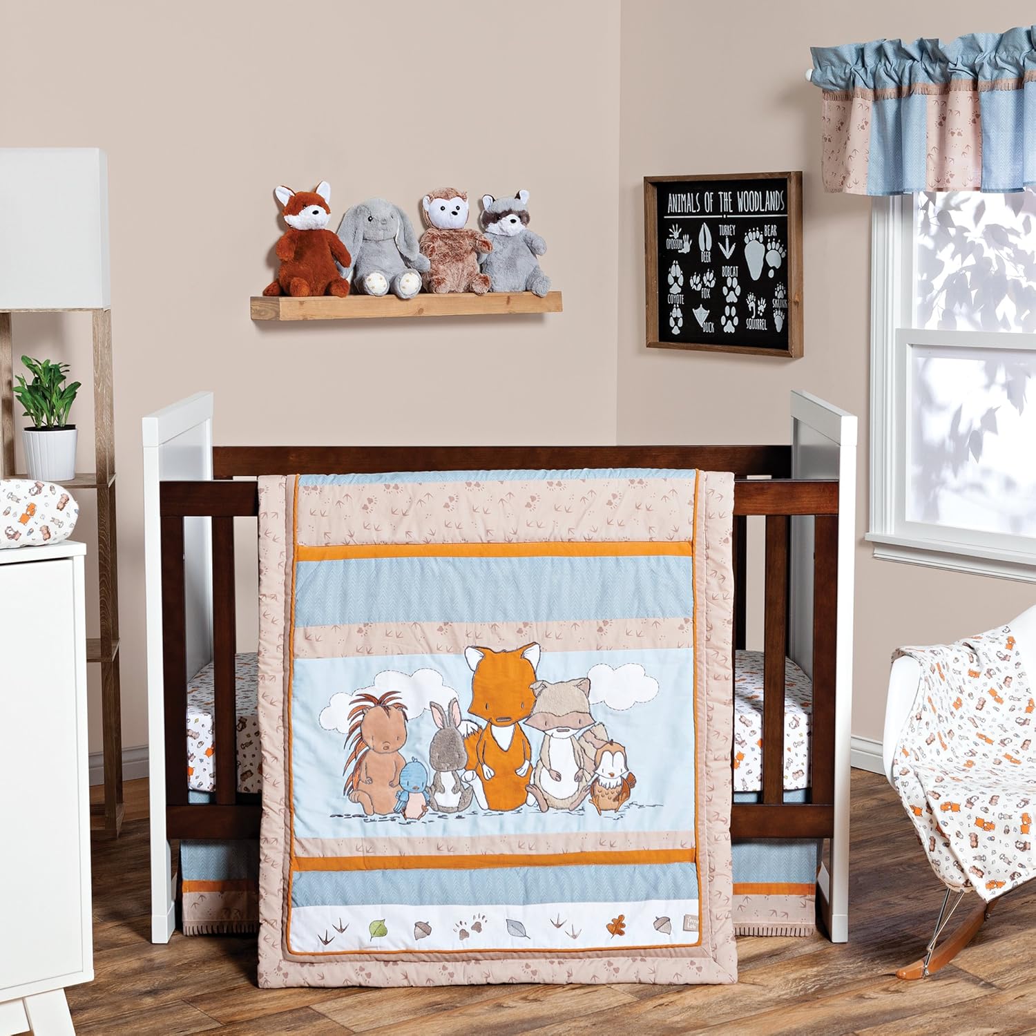 Adventure awaits with Trend Lab's Wild Woods Bunch bedding collection. Adorable woodland friends will take your little one on a wonderful journey. Applique and embroidered hedgehog, bird, bunny, fox, raccoon and owl are off on a grand adventure to discover their dreams, big and small, wherever they may be found. Please adhere to JPMA's Safe Infant Bedding Practices. Set includes: Quilt, Skirt and Fitted Crib Sheet Reversible 100% cotton (exclusive of decoration) quilt measures 35 in x 45 in Flat panel crib skirt fits standard crib 28 in x 52 in with a 13-inch drop and is finished with fringe throughout the bottom Fitted 100% cotton crib sheet fits standard crib mattress 28 in x 52 in with 8-inch deep pockets and is fully elasticized Coordinates with the Wild Woods Bunch collection by Trend Lab.