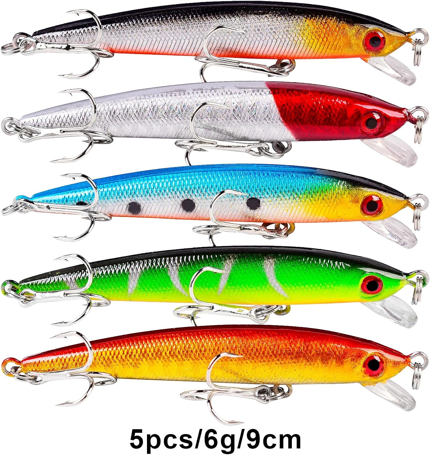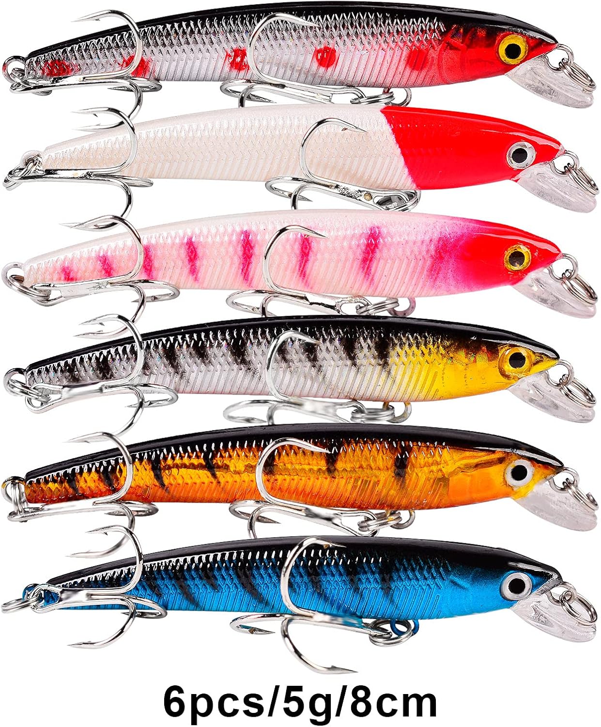 Especificación 1. 43 piezas MI006 Minnow - 35 piezas Longitud: 2.95in a 3.85in Peso: 0.16oz a 0.28oz Armado con anzuelos de triple 6#/8# CrankBaits - 8 piezas Longitud: 1.96in Peso: 0.13oz Anzuelos: 10# Anzuelos de acero al carbono 2. 43 piezas MI007 Minnow - 35 piezas Longitud: 2.75in a 3.74in Peso: 0.16oz a 0.27oz Armado con anzuelos de triple 6#/8# CrankBaits - 8 piezas Longitud: 1.96in Peso: 0.13oz Anzuelos: 10# Anzuelos de acero al carbono 3. 40 piezas ST071 Minnow - 16 piezas Longitud: 2.75in a 4in Peso: 0.14oz a 0.33oz CrankBaits - 14 piezas Longitud: 1.85in a 3.07in Peso: 0.13oz a 0.41oz Popper - 8 piezas Longitud: 2.75in a 3.66in Peso: 0.31oz a 0.46oz Pencil - 2 piezas Longitud: 3.26in Peso: 0.31oz 4. 20 piezas ST072 Minnow - 8 piezas Longitud: 2.75in a 3.94in Peso: 0.14oz a 0.3oz CrankBaits - 7 piezas Longitud: 1.85in a 3in Peso: 0.13oz a 0.4oz Popper - 4 piezas Longitud: 2.75in a 3.66in Peso: 0.31oz a 0.46oz Pencil - 1 pieza Longitud: 3.26in Peso: 0.31oz 5. 20 piezas ST073 Minnow - 8 piezas Longitud: 2.75in a 4in Peso: 0.14oz a 0.33oz CrankBaits - 7 piezas Longitud: 1.85in a 3.07in Peso: 0.13oz a 0.41oz Popper - 4 piezas Longitud: 2.75in a 3.66in Peso: 0.31oz a 0.45oz Pencil - 1 pieza Longitud: 3.26in Peso: 0.31oz