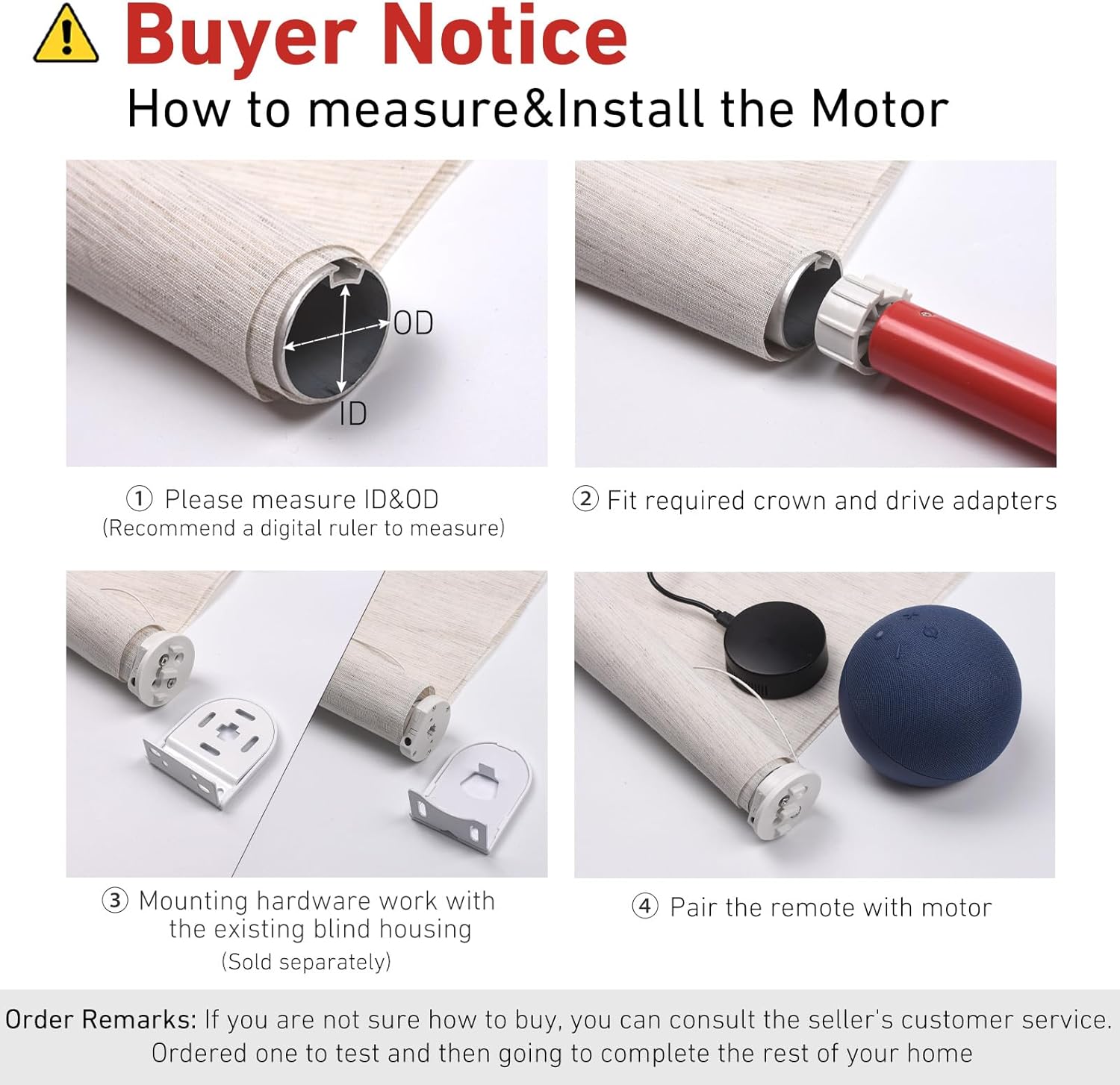 Easy installation&Measurement-- Simple way to retrofit your roller blinds with motorisation: ① Unclip your blind and remove your chain drive ②Measure ID and OD of the shade tube to choose a right size of the shade motor, ID to help to choose the diameter of shade motor, OD is helpful to choose the drive parts on the motor. ③ Insert your motor④ Set up your controls,You're all done retrofitting motorisation