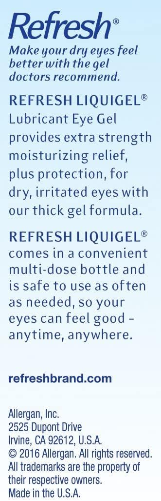 Refresh Gel Drops for Dry Eyes Make your dry eyes feel better with the drops doctors recommend. Refresh Liquigel Lubricant Eye Drops provide extra strength moisturizing relief plus protection for dry, irritated eyes with our thick gel formula. Refresh Liquigel comes in a convenient multi-dose bottle and is safe to use as often as needed, so your eyes can feel good - anytime, anywhere. For the temporary relief of burning, irritation, and discomfort due to dryness of the eye or exposure to wind or sun. May be used as a protectant against further irritation. Directions: Instill 1 or 2 drops in the affected eye(s) as needed. Other Information: Use only if imprinted tape seals on top and bottom flaps are intact and clearly legible. Store at 59-86FRetain this carton for future reference. Warnings: For External Use only to avoid contamination, do not touch the tip of the container on any surface. Replace cap after using.