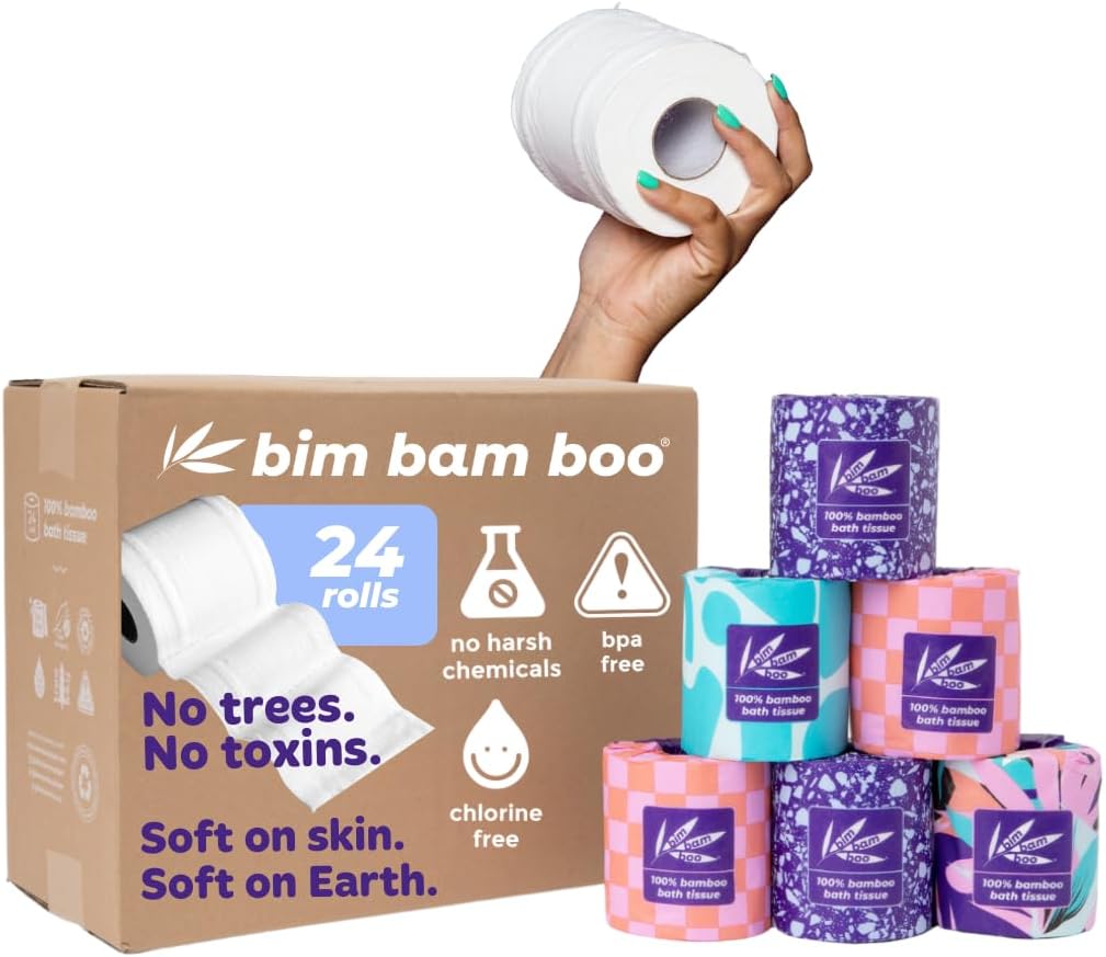 Bim Bam Boo 100% Bamboo Organic Chemical-Free Bulk Toilet Paper, Cloud-like Softness, Plant-Based Sustainable Tree-Free Bathroom Tissue, 24 Eco-Friendly Rolls, 2 Ply, 295 Sheets for RV and Camping