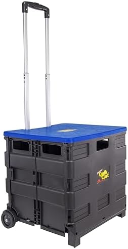 Original Quick Cart. Use it, abuse it, store it! This can be used for transporting, shopping, traveling, portable storage, and seating and as a stepping stool. This can be abused by hauling up to 80 pounds, has a durable heavy duty plastic seat. It can be stored by collapsing down to 3 inches thick, is rust proof, and weighs less than 8 pounds. This package contains one box trolley with the dimension 18x18x3 inch. This rolling bin facilitates the transport of groceries for seniors like no other utility carrier because of its ergonomic retractable handle. Keep your document organized on this wheeled utility organizer. Use this rolling cart (folding cart) as a rolling tool box, rolling cart for teachers, laundry basket with wheels, rolling files carts with wheels or file crate.