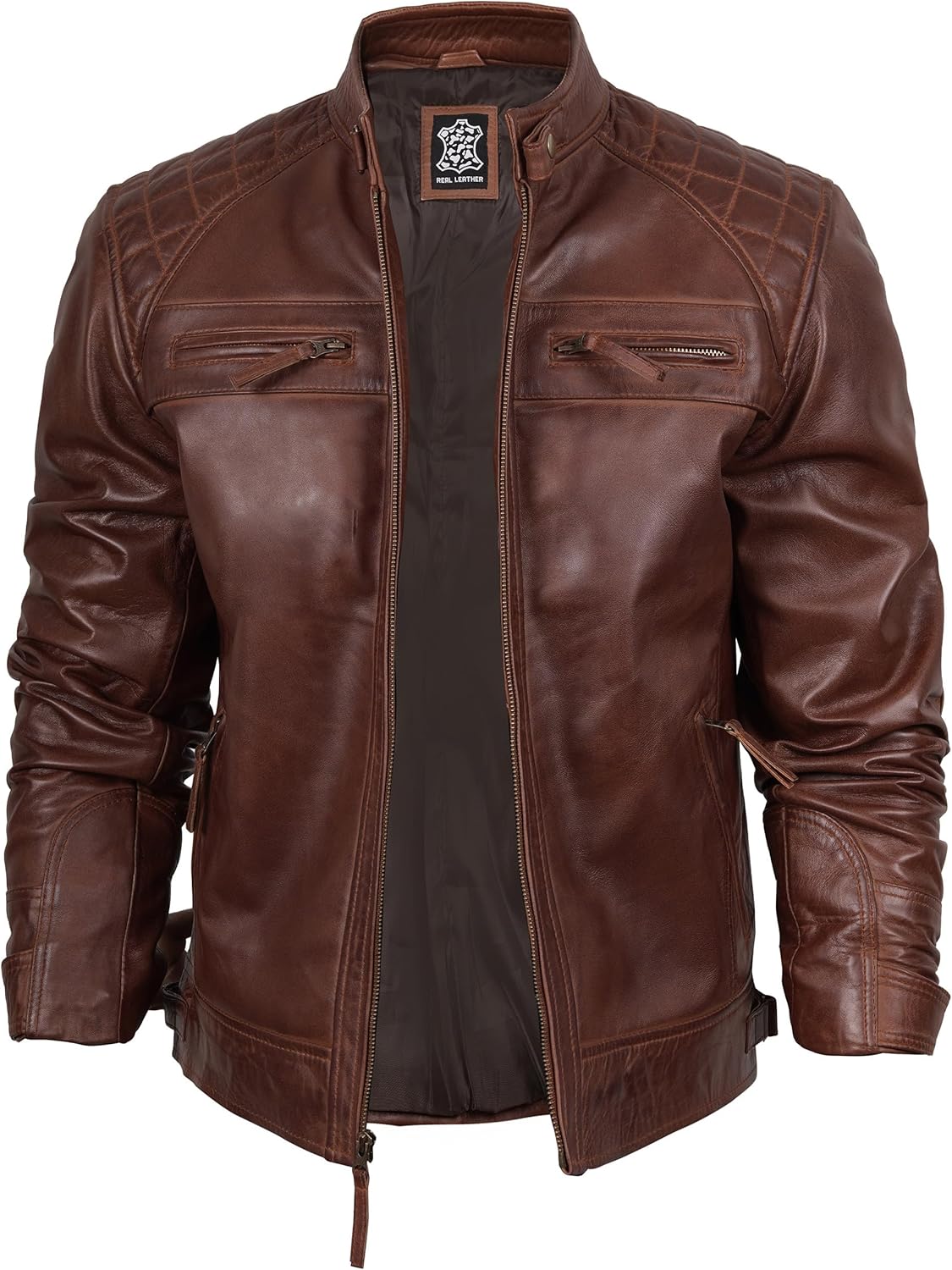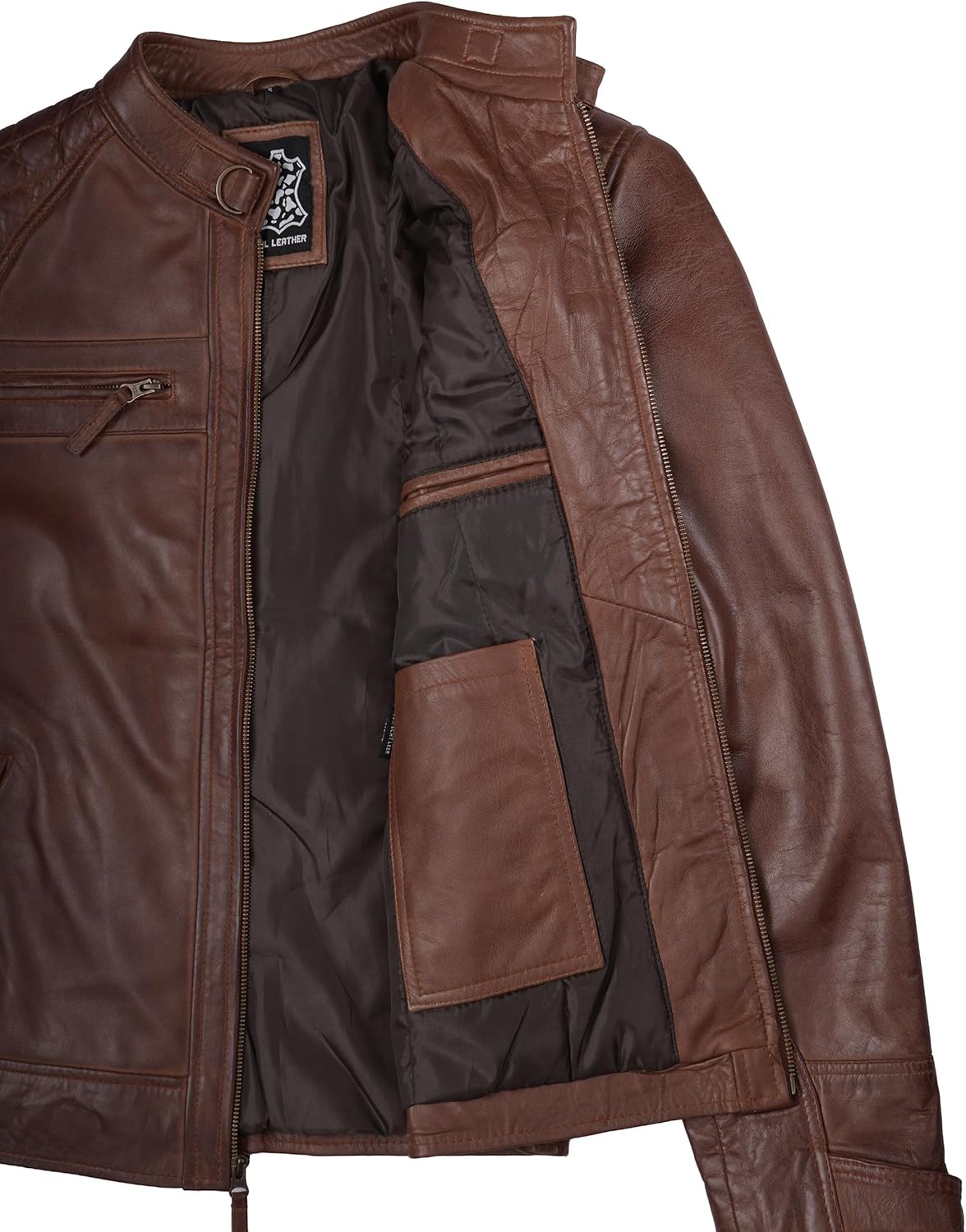 Chaquetas de Hombre de Piel de Cordero Real - Chaquetas de Cuero Estilo Moto Con Cremallera Acolchadas Cafe Racer