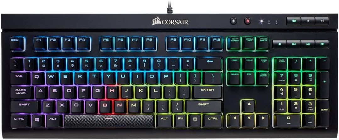 El teclado mecánico ultra duradero Corsair K68 RGB combina una vívida retroiluminación RGB por cada tecla, resistencia al agua y al polvo de hasta IP32, y 100 por ciento de interruptores Cherry MX. Crea impresionantes efectos de iluminación dinámica y macros que cambian el juego en el software Corsair Utility Engine (CUE) para adaptarse a tu estilo y darte una ventaja en el juego. Los controles dedicados de volumen y multimedia te permiten ajustar tu audio sin interrumpir tu juego. Un modo de bloqueo de la tecla Windows dedicado garantiza un juego sin interrupciones, mientras que un apoyamuñecas removible proporciona una comodidad óptima sin importar cómo juegues. Pase lo que pase mientras juegas, podrás seguir jugando.