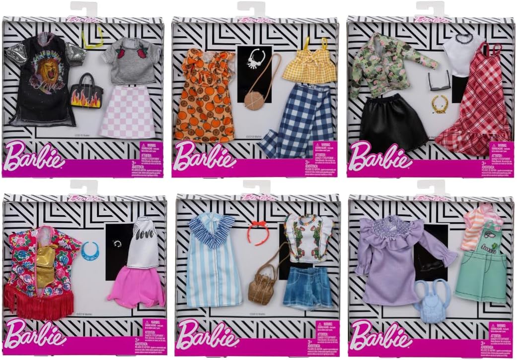 Upgrade any Barbie wardrobe instantly with six complete fashion ensembles. Each outfit includes a coordinated top, bottom, and accessories—handbags, shoes, jewelry—that transform playtime into a runway. From casual denim and floral dresses to sporty and edgy looks, these packs support endless mix‑and‑match creativity. All garments are standard Barbie size and compatible with other clothing pieces in your collection. Ideal for ages 3+ and perfect as a birthday or holiday gift for fashion-loving kids and collectors alike.