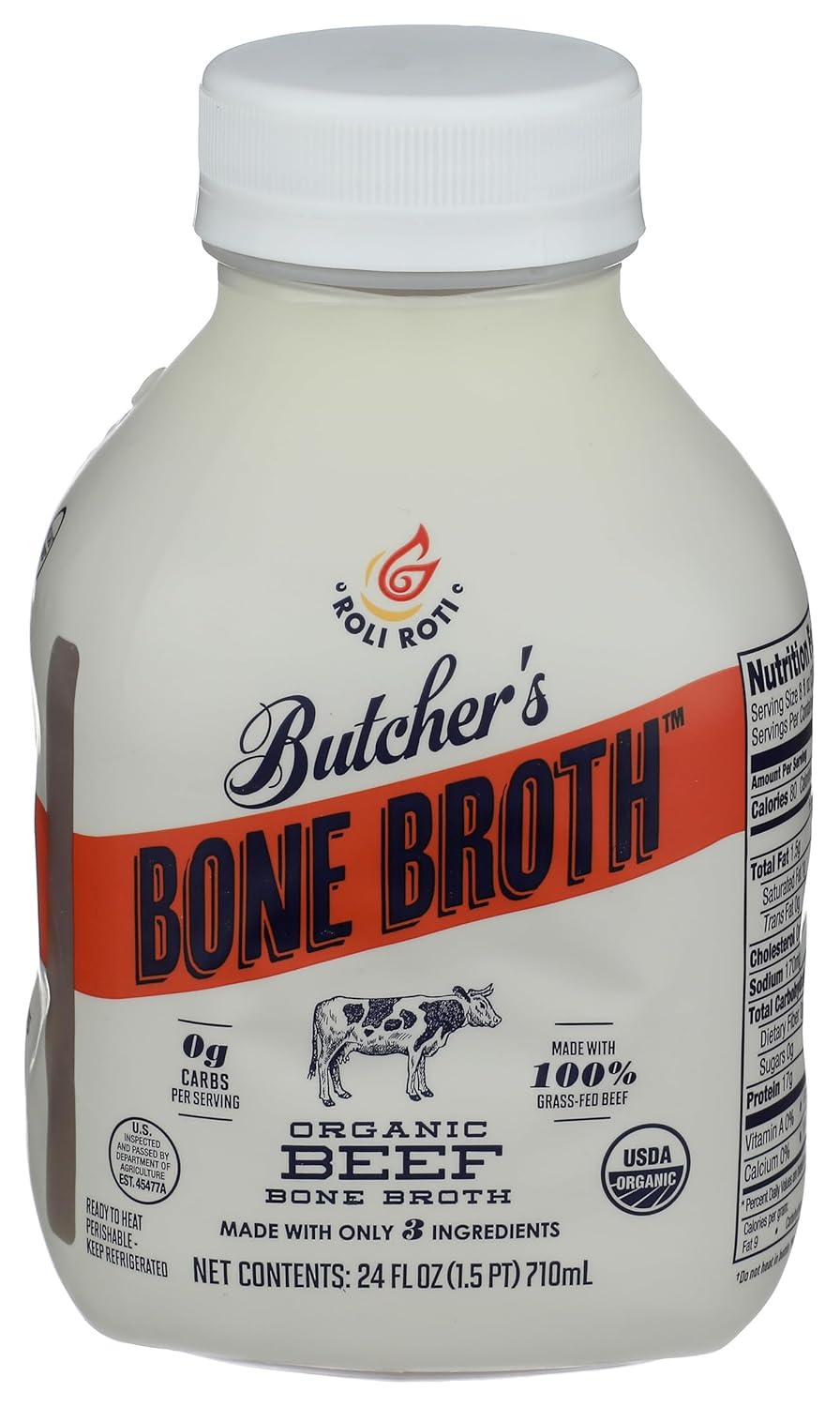 Roli roti butcher's bone broth organic beef broth makes an excellent base for your homemade soups and stews. Made by simmering grass-fed and finished beef for 48 hours, this hearty bone broth also works well for seasoning rice and potatoes or making gravies and sauces. Alternatively, keep this 24 fl oz bottle in your refrigerator, and heat it up for sipping when you want a paleo-friendly snack.