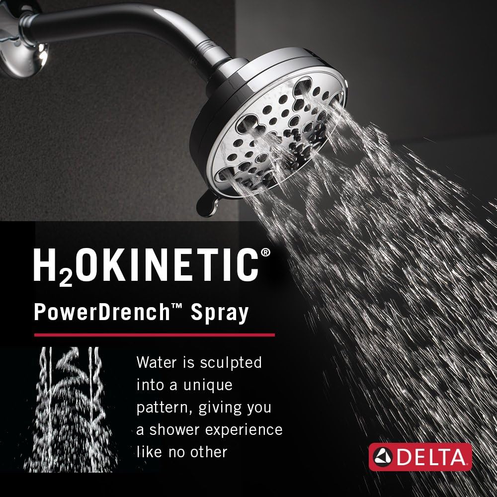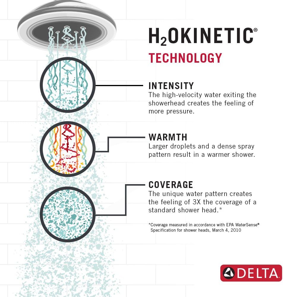 Delta® H2Okinetic® Showers look different because they are different. Using advanced technology, H2Okinetic showers sculpt water into a unique pattern, giving you 3X the coverage of a standard shower head.* The end result is a shower that provides more coverage, more warmth and more intensity for a truly drenching shower experience. So go ahead and indulge, because now you can enjoy the feeling of more water without using more water. While other products may gather unsightly mineral build-up over time, Delta soft rubber Touch-Clean® spray holes allow any mineral residue to simply be wiped away for an instantly refreshed look – with no need for soaking or the aid of chemical cleaners. The pause setting gives you ample space for shaving, lathering and other shower tasks, without worrying about overspray or water waste. This spray setting helps you conserve water, so you can worry less about depleting your supply of hot water - and you help the environment too. Delta WaterSense labeled faucets, showers and toilets use at least 20% less water than the industry standard—saving you money without compromising performance. *Coverage measured in accordance with EPA WaterSense® Specification for shower heads, March 4, 2010.