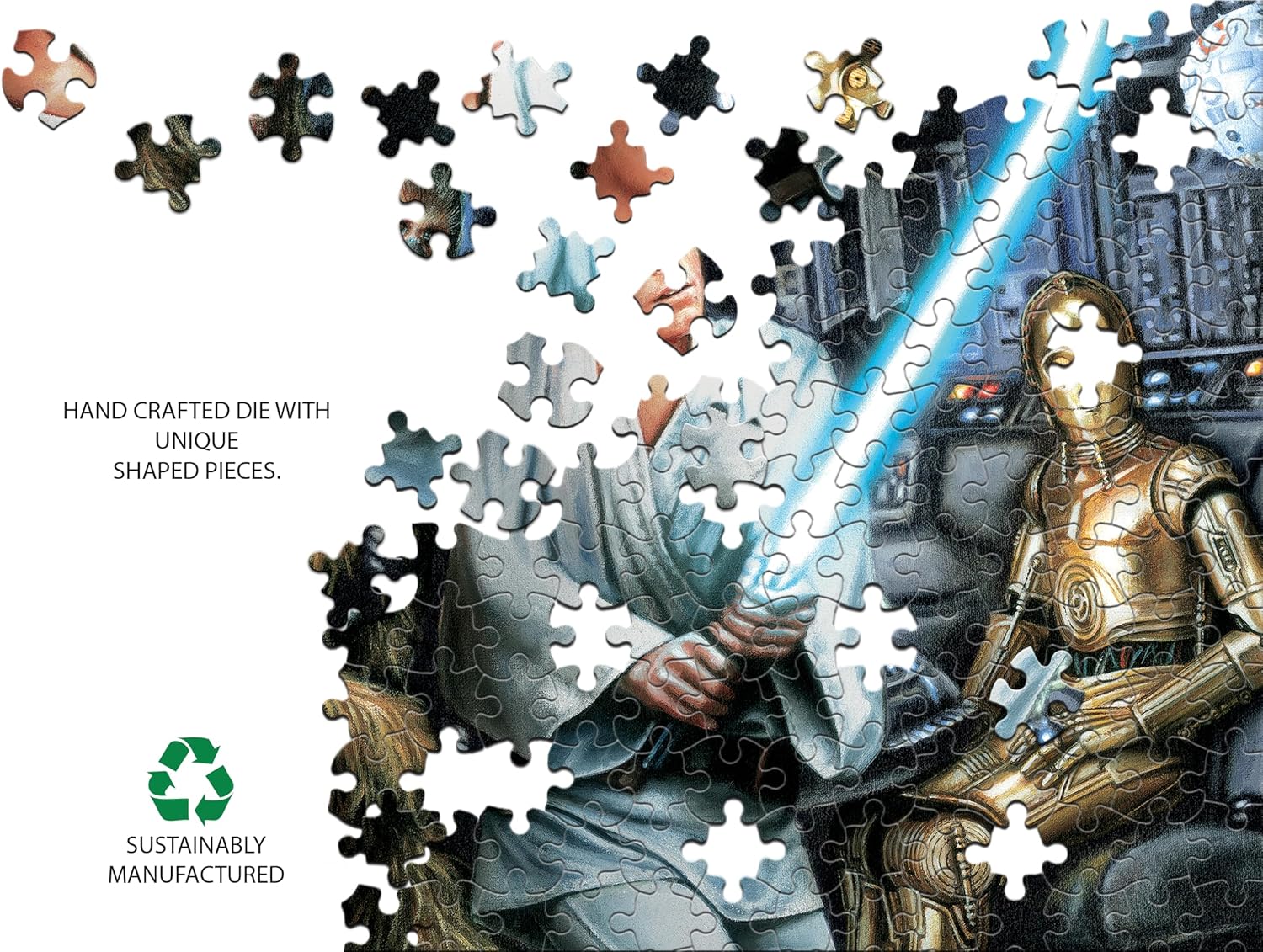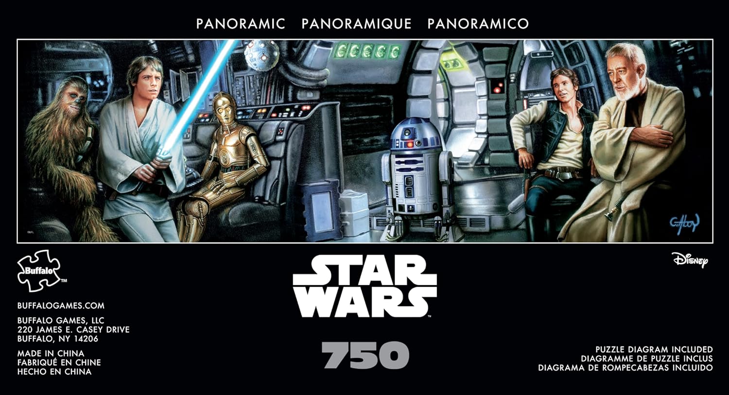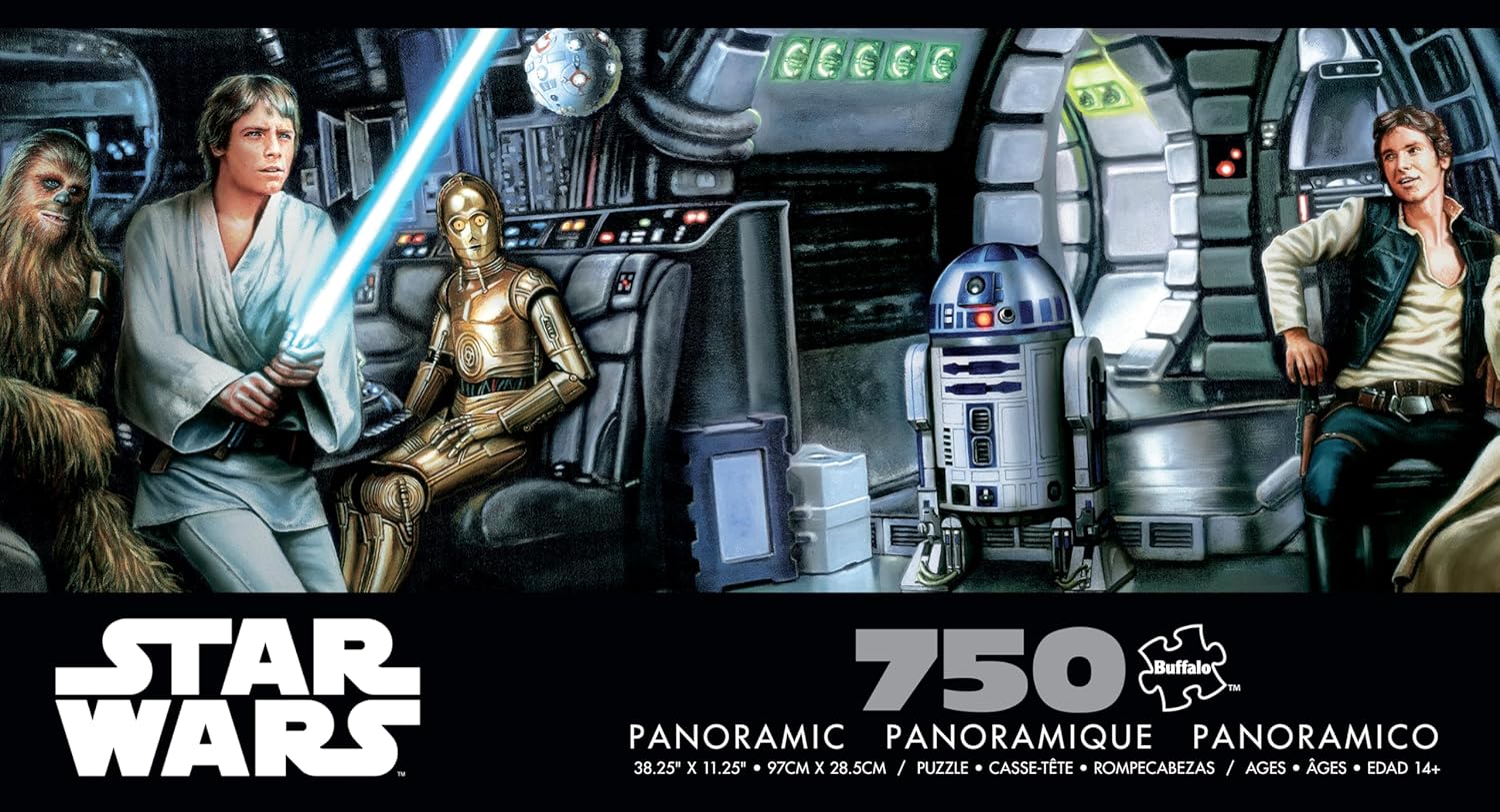 This 750-piece 38.25 x 11.25 inch interlocking panoramic Star Wars(TM) jigsaw puzzle for ages 14+ is titled “Jedi Training Begins”. It features Luke Skywalker wielding his father’s lightsaber against a training remote onboard the Millenium Falcon, under the tutelage of Obi-wan Kenobi, while Han Solo, Chewbacca, C-3PO and R2-D2 look on. Every Buffalo Games jigsaw puzzle is manufactured from recycled puzzle board. A precision cutting technique guarantees that every piece will fit soundly with the company's signature Perfect SnapTM. A bonus puzzle poster is also included so that you have a handy reference of what the completed puzzle should look like while you put yours together. © & ™ Lucasfilm Ltd.