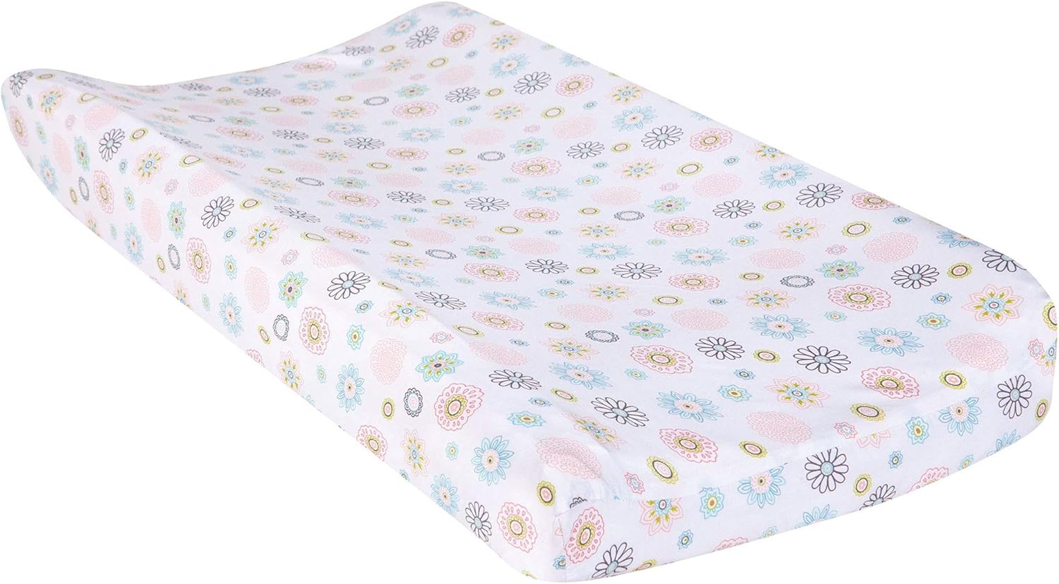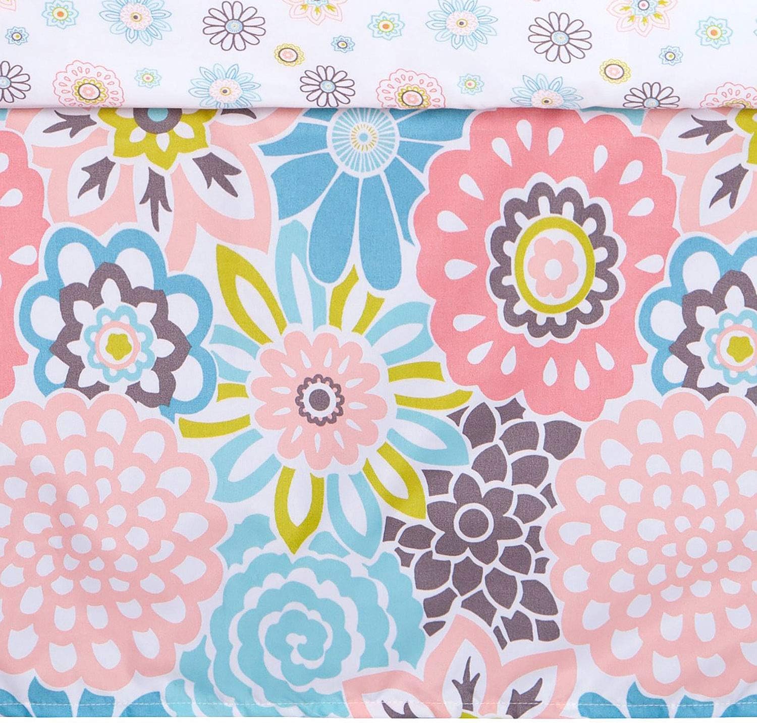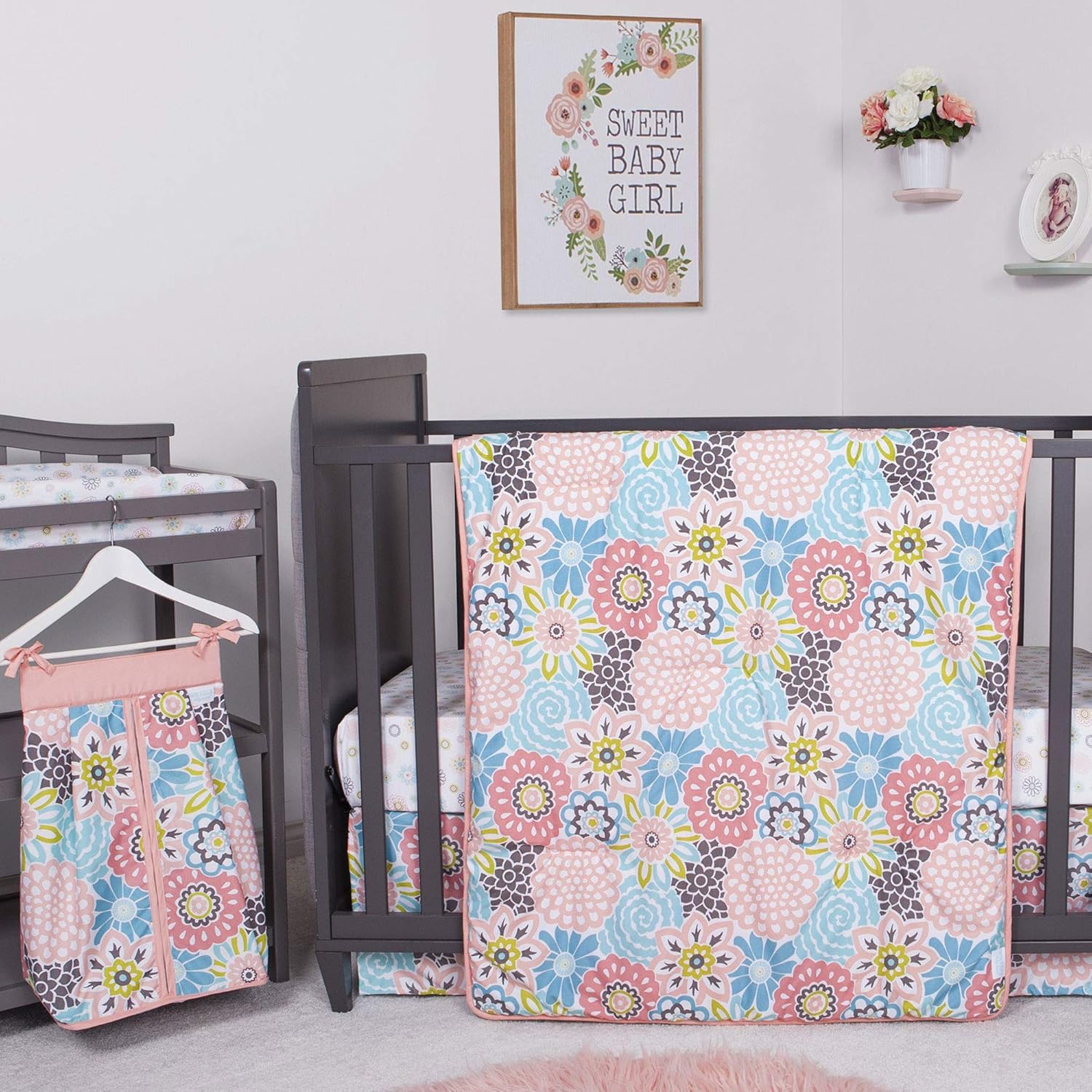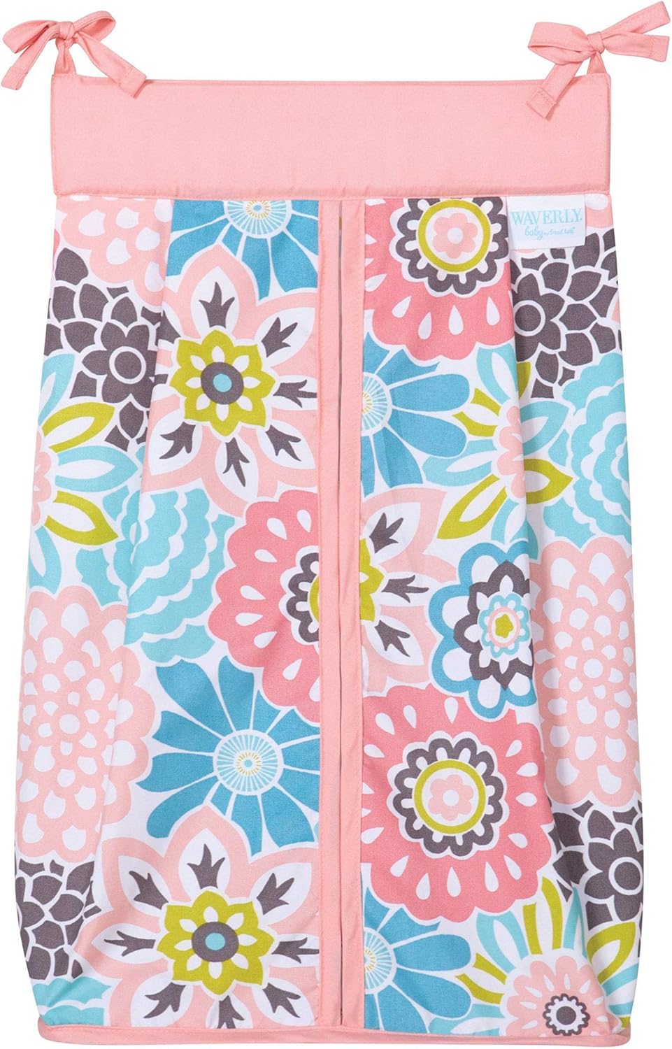 Brighten up your little girl's nursery with the Waverly Blooms 5-Piece Crib Bedding Set from Waverly Baby by Trend Lab. The reversible quilt is filled with a gorgeous oversized floral print on the front and a coordinating floral scatter print on the back. The color palette is a vibrant mix of hues coral and turquoise, with accents of gray and green. Perfect for your girly girl. This collection will complement your home decor beautifully. Please adhere to JPMA's Safe Infant Bedding Practices. Set includes: Quilt, Crib Skirt, Fitted Crib Sheet, Changing Pad Cover and Diaper Stacker Reversible Quilt measures 35 in x 45 in Fitted Crib Sheet fits a standard 28 in x 52 in crib mattress and features 8-inch-deep pockets with elastic surrounding the entire opening ensuring a more secure fit. Flat Panel Crib Skirt with a 13 inch drop fits a standard crib measuring 28 in x 52 in. Changing Pad Cover is soft and fully elasticized to offer a sleek tailored fit on standard 16 in x 32 in contoured changing pads. Diaper Stacker measures 12 in x 20 in x 8 in and can hold up to three dozen diapers. Ties allow for easy attachment to most dressers and changing tables.