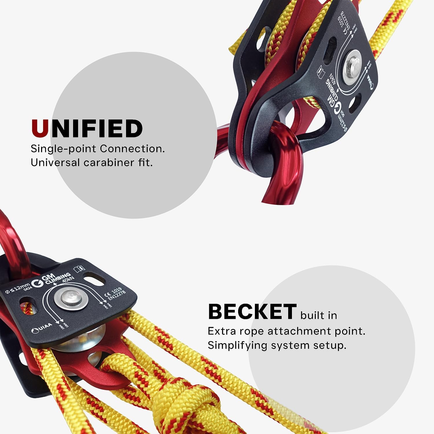 【40kN, Certificado CE/UIAA】Hecha de materiales avanzados para soportar una fuerza de rotura súper alta de 40 kN=2 x (10kN+10kN). Certificada CE y UIAA, la Micro Doble Polea cumple con los estándares de seguridad requeridos en una amplia gama de operaciones, asegurando un uso seguro en situaciones de alta demanda. Configure sistemas mecánicos de ventaja personal que funcionen para izar cargas en montañismo, rescatar un coche o barco varado, o sacar a su compañero de una grieta profunda.