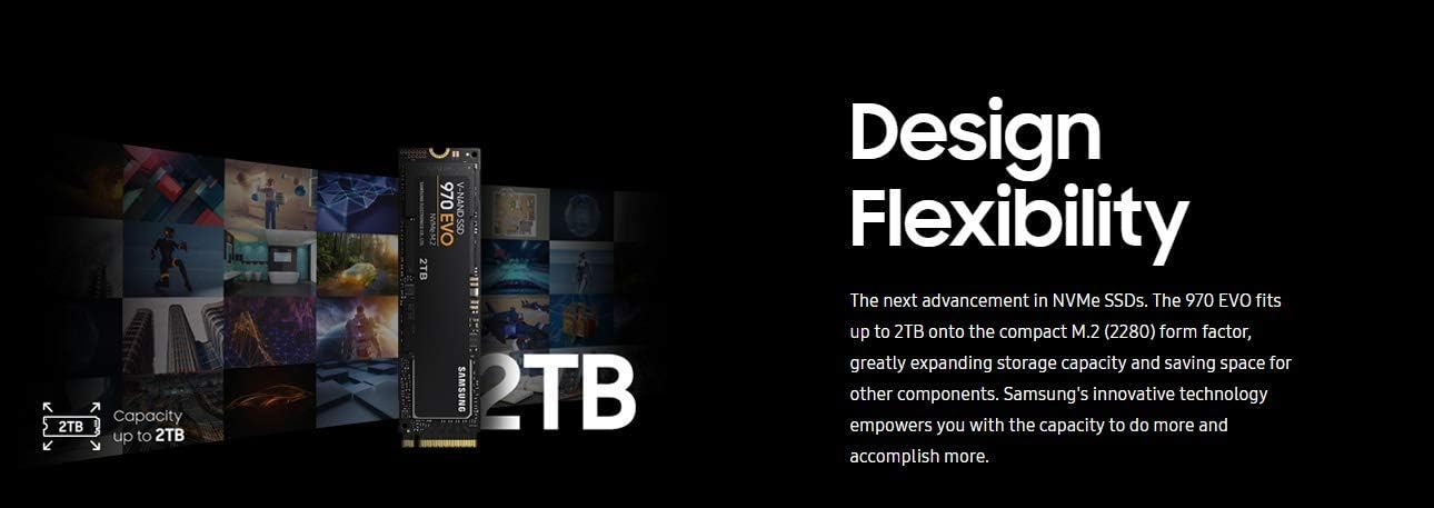 TECNOLOGÍA INNOVATIVA V NAND: Impulsada por la Tecnología V NAND de Samsung, la interfaz NVMe (PCIe M.2 2280) del SSD 970 EVO ofrece una mayor ancho de banda, baja latencia y eficiencia energética ideal para entusiastas de la tecnología, jugadores de alto nivel y diseñadores de contenido 4K y 3D*