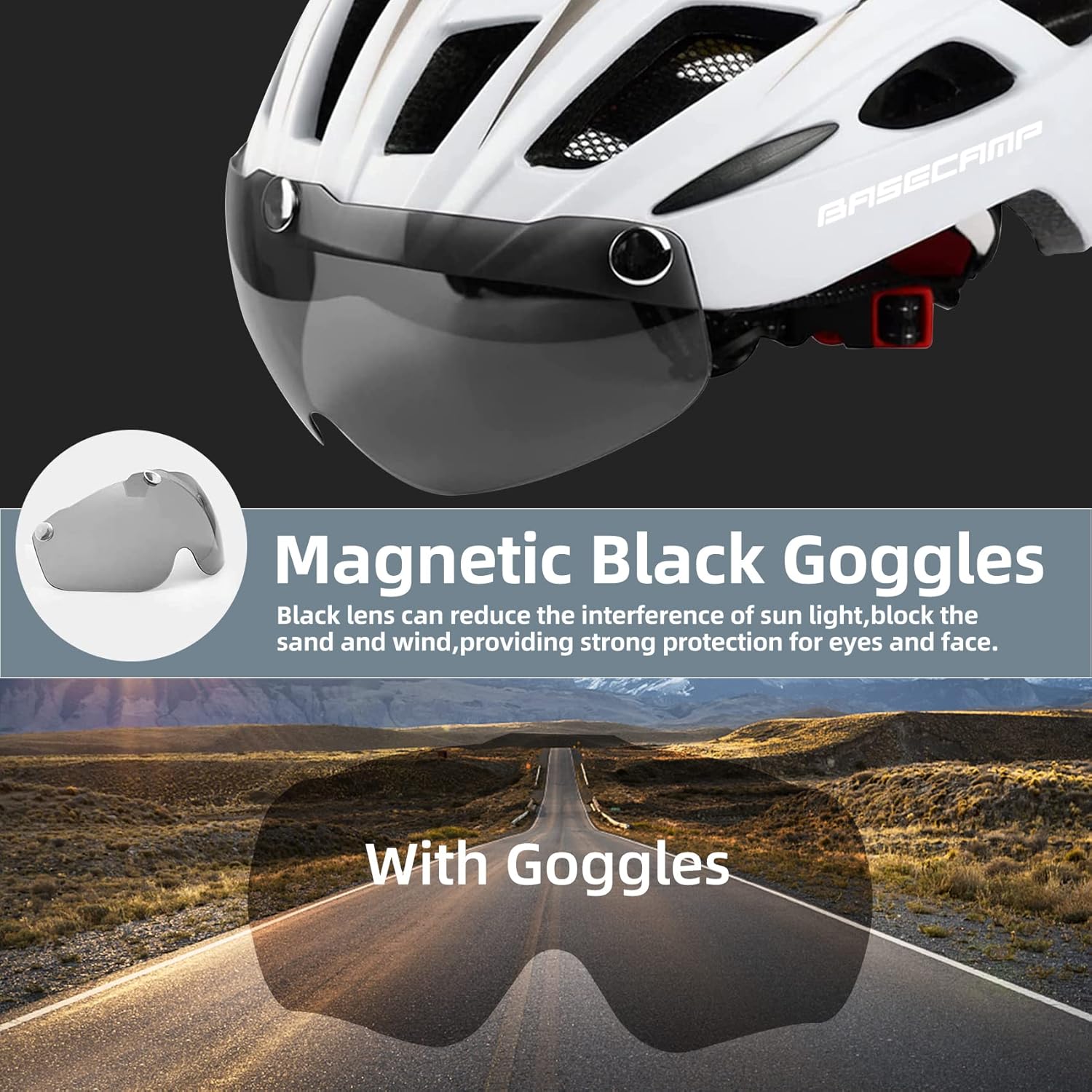 Bike Helmet, Basecamp Bicycle Helmet with Rear Light & Detachable Magnetic Goggles Lightweight Cycling Helmet Adjustable for Adult Men Women Mountain & Road (BC-069)