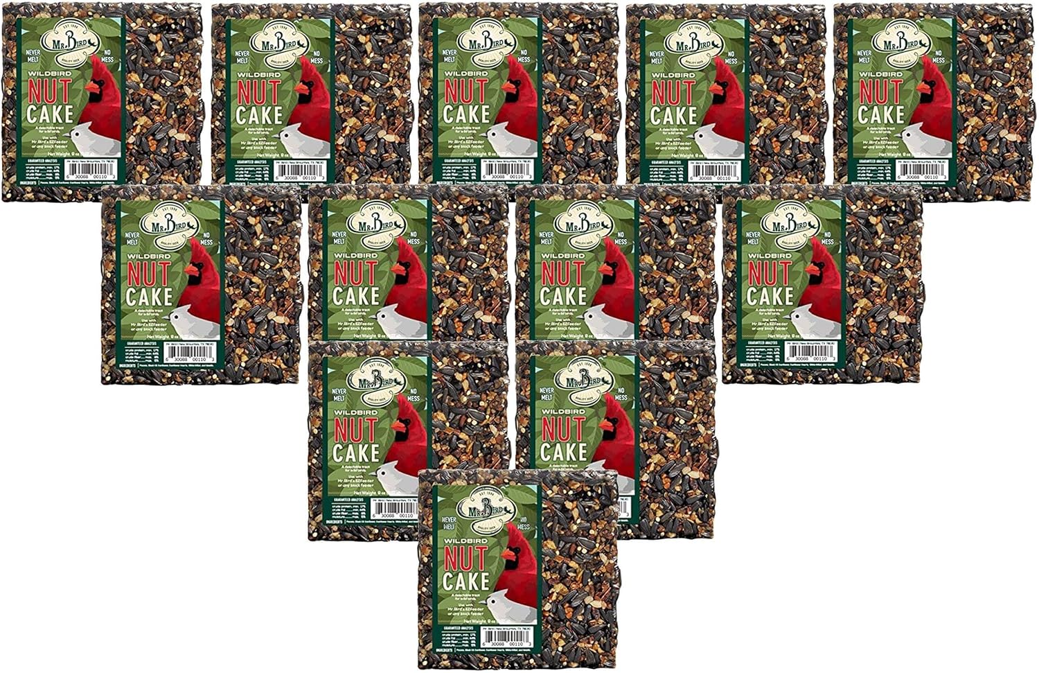 This 12 pack bundle of 8 oz. small seed and pecan blocks are the perfect size for any standard suet basket or use in the Mr.Bird's NeatFeeder. An amazing variety of birds visit these NutCakes. In addition to the regular feeder birds such as; Cardinals, chickadees, woodpeckers, nuthatches, finches, and titmice, we have reports of various warblers, wrens, kinglets, mockingbirds, and even bluebirds eating these NutCakes. No waste, no mess, never melt. Ingredients: Pecans, black oil sunflower, sunflower hearts, white millet, and gelatin.
