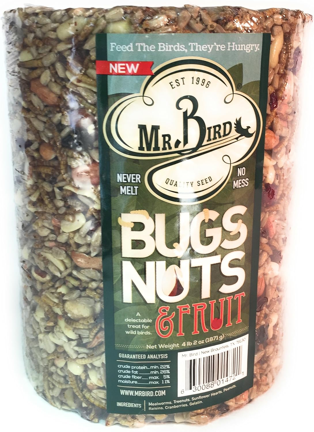 Proudly MADE IN THE USA! Bugs, Nuts & Fruit LARGE Cylinder Bugs, Nuts & Fruit A delectable feast for an amazing variety of wild birds. This formula is sure to attract your favorite feathered friends Practical & Easy to Use Easily hang with the Mr. Bird EZ Feeder. Will also work with most cylinder feeders. Long Lasting! Generous size means this cylinder will last for days and days, no more running out to refill the feeders constantly. It can't be kicked all over the place like lose seed can. Large size lasts a long time and attracts loads of birds. No waste, no mess, never melt. A Healthy Diet for your Feathered Friends An amazing variety of birds visit these Seed Cylinders! In addition to the regular feeder birds such as; Cardinalschickadeeswoodpeckersnuthatchesfinchestitmice We have reports of various warblers, wrens, kinglets, mockingbirds, and even bluebirds eating these Seed Blocks. What makes this product special is the formula; a fantastic blend of mealworms, pecans, sunflower hearts, raisins and cranberries. BUG APPETIT! You will see the quality and the dramatic results in your own yard. No Waste or Mess Quality ingredients means these seed cylinders attract birds much more quickly than suet and without the problem of melting in the summer heat. Great for year-round bird feeding