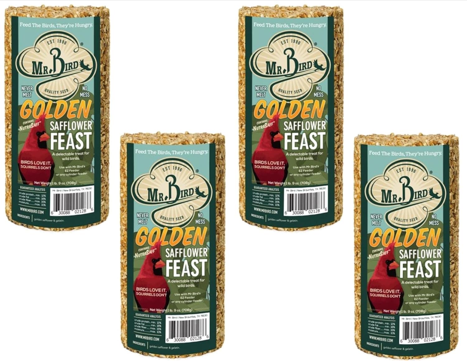 4 Pack Bundle of 25 oz. Seed Cylinders! This 100% 25 oz. seed cylinder is excellent for squirrel prone areas, as squirrels generally don't like safflower. These cylinders are preferred by cardinals, grosbeaks and more, where grackles, sparrows and starlings generally don't like safflower. The golden safflower seed is softer than traditional safflower, so will attract a great number of birds. Golden Safflower is different than your normal safflower seed because its higher in oil content, higher in protein, and higher in fat - Making it more desirable to birds! This Mr. Bird cylinder will perform best when kept dry. Attracts birds much more quickly than suet and without the problem of melting in the summer heat. Great for year-round bird feeding.