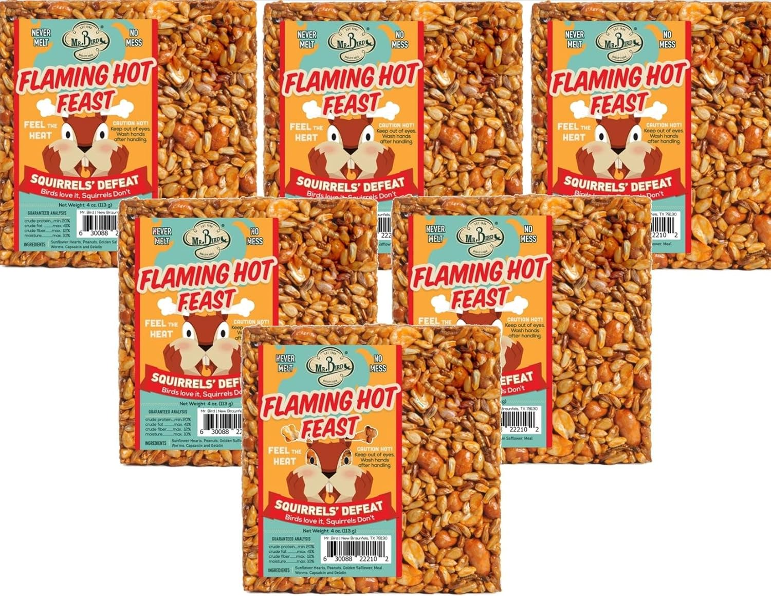 Feed the birds with Flaming Hot Feast-squirrels not invited! 6 Pack of 4 oz. Flaming Bird Seed Cakes! Discover spicy hot snacks for bird feeding without squirrels! After the first taste, most squirrels search for food elsewhere because they can't stand the fiery-hot sensation, which won't bother your birds. Contains whole sunflower hearts, shelled peanuts, golden safflower seed, mealworms and capsaicin. Perfect for year-round feeding! The convenient center hole allows for this seed cake to be mounted on a MR.BIRD cylinder feeder.This MR.BIRD seed cake will perform best when kept dry. This product contains a strong eye, nose and skin irritant. Wash hands thoroughly with soap and water after handling and keep out of reach of children