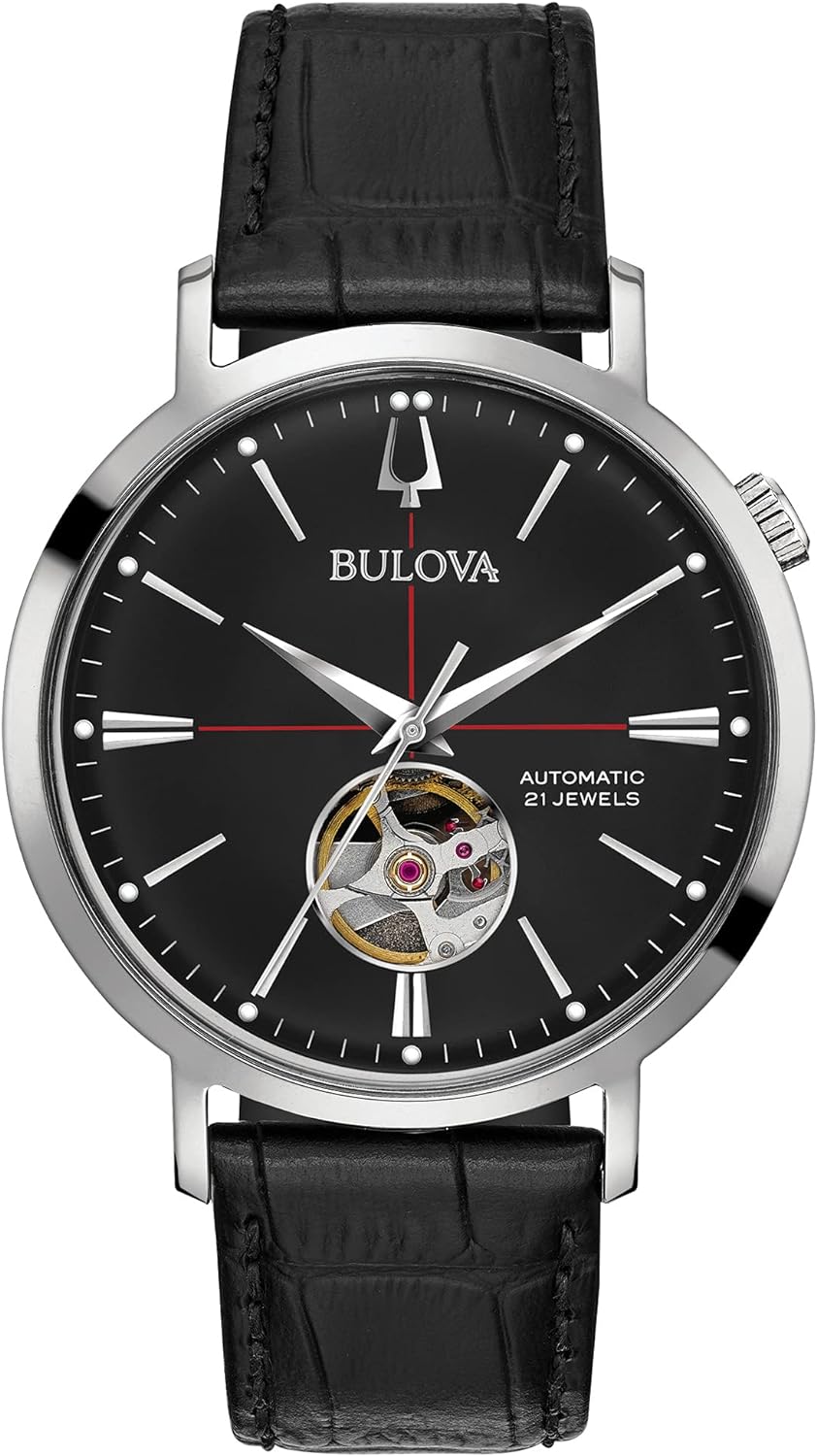 Reloj automático de pulsera de cuero Bulova Men's Classic Aerojet 3-manos, apertura abierta, reserva de marcha de 40 horas, cristal mineral doble curvado, 41 mm
