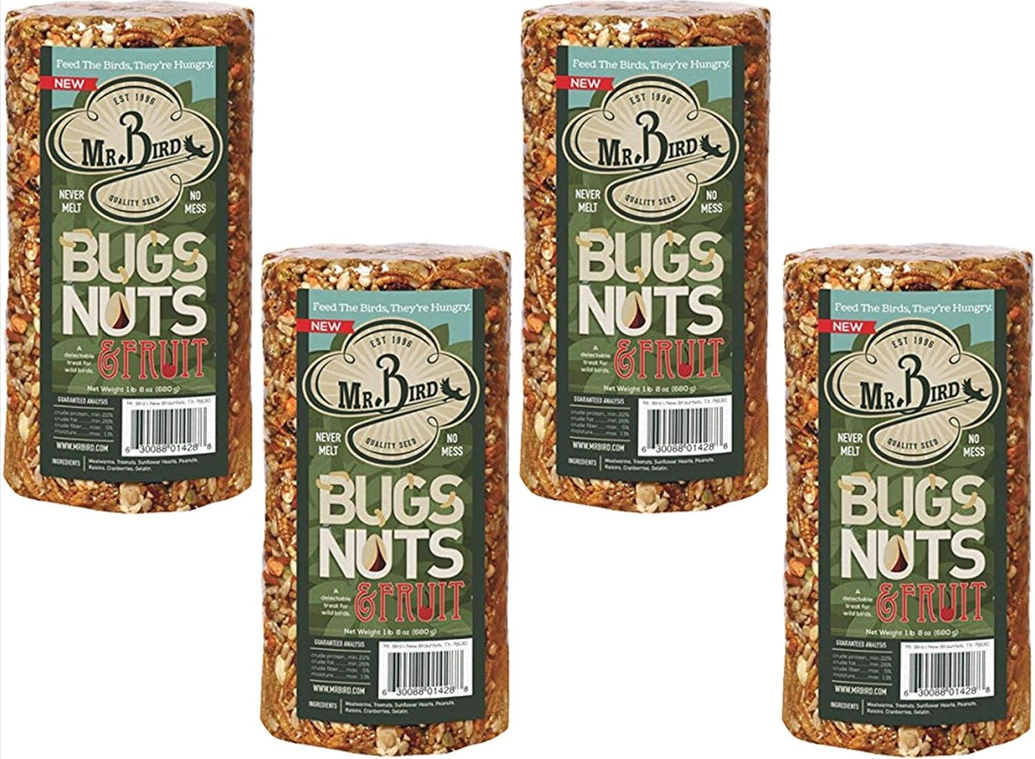 4 Pack of Mr. Bird Bugs, Nuts, Fruit Wild Bird Seed Log. 24 oz. Contains Meal Worms, Tree Nuts, Pecans, Peanuts, Sunflower Hearts, Raisins and Cranberries. Guaranteed bird happiness, NUTS+BUGS=YUM. Attract an amazing variety of backyard birds for your viewing pleasure with a gratifying selection of cherries, mealworms, peanuts, pecans and sunflower hearts in this easy-to-serve 24 oz. seed cylinder. Watch birds eat every bit because this delicious and nutritious bird snack is 100% edible. Happy Birding! This Mr. Bird cylinder will perform best when kept dry. Place on the ground, on a platform or cylinder feeder and enjoy your birds. Individually wrapped for freshness and easy storage.