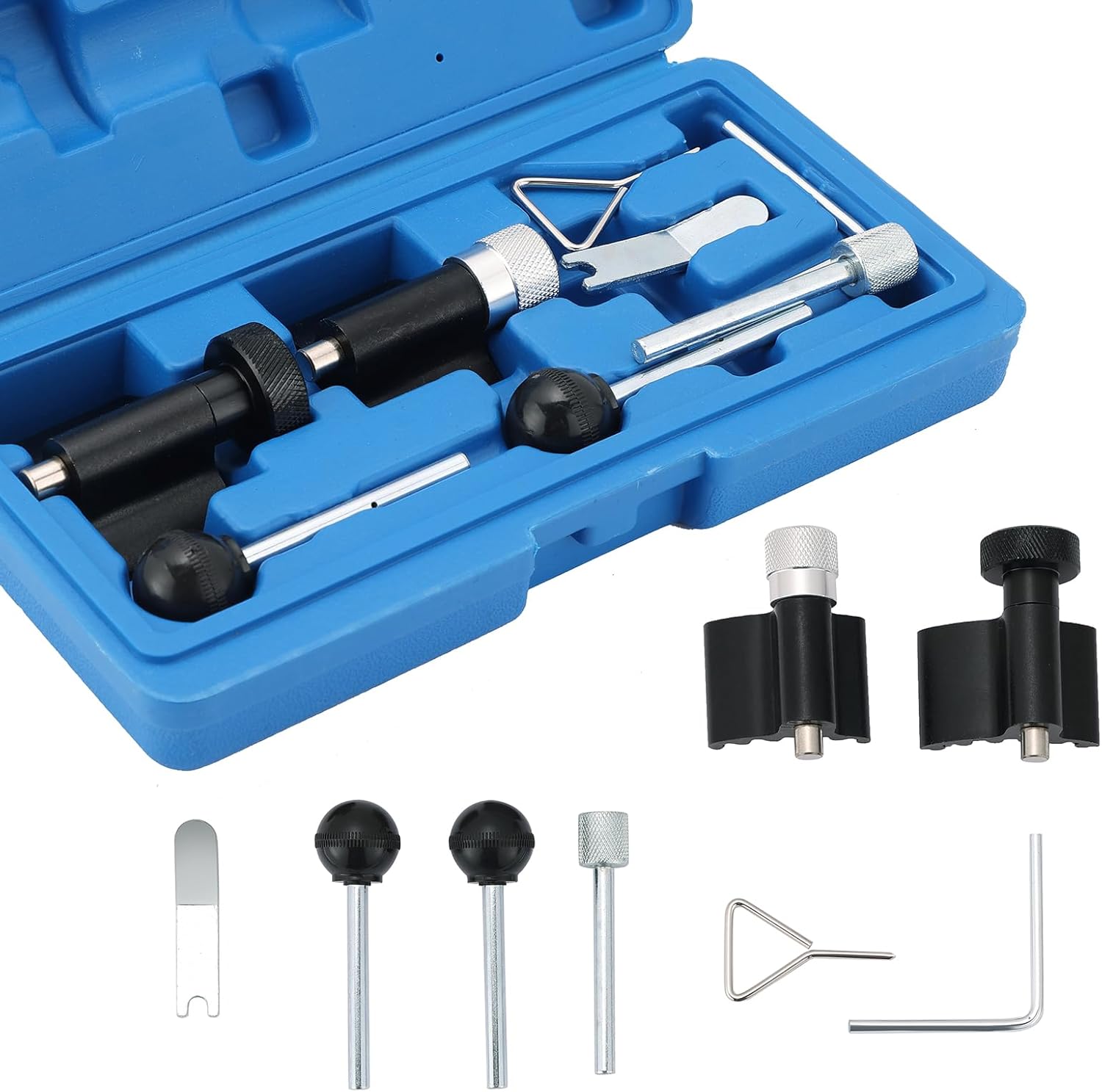 CONJUNTO DE HERRAMIENTAS COMPLETO: Este juego de herramientas de bloqueo de alineación de cárter incluye 2 herramientas de bloqueo de eje de cárter (OEM T10100 para rueda de eje oval y T10050 para rueda de eje redonda), pasador de bloqueo de bomba de inyección, herramienta de bloqueo de tensor y pasadores de bloqueo de tensor de correa auxiliar. Además, viene con una caja de herramientas de plástico conveniente para un almacenamiento y transporte sin esfuerzo.