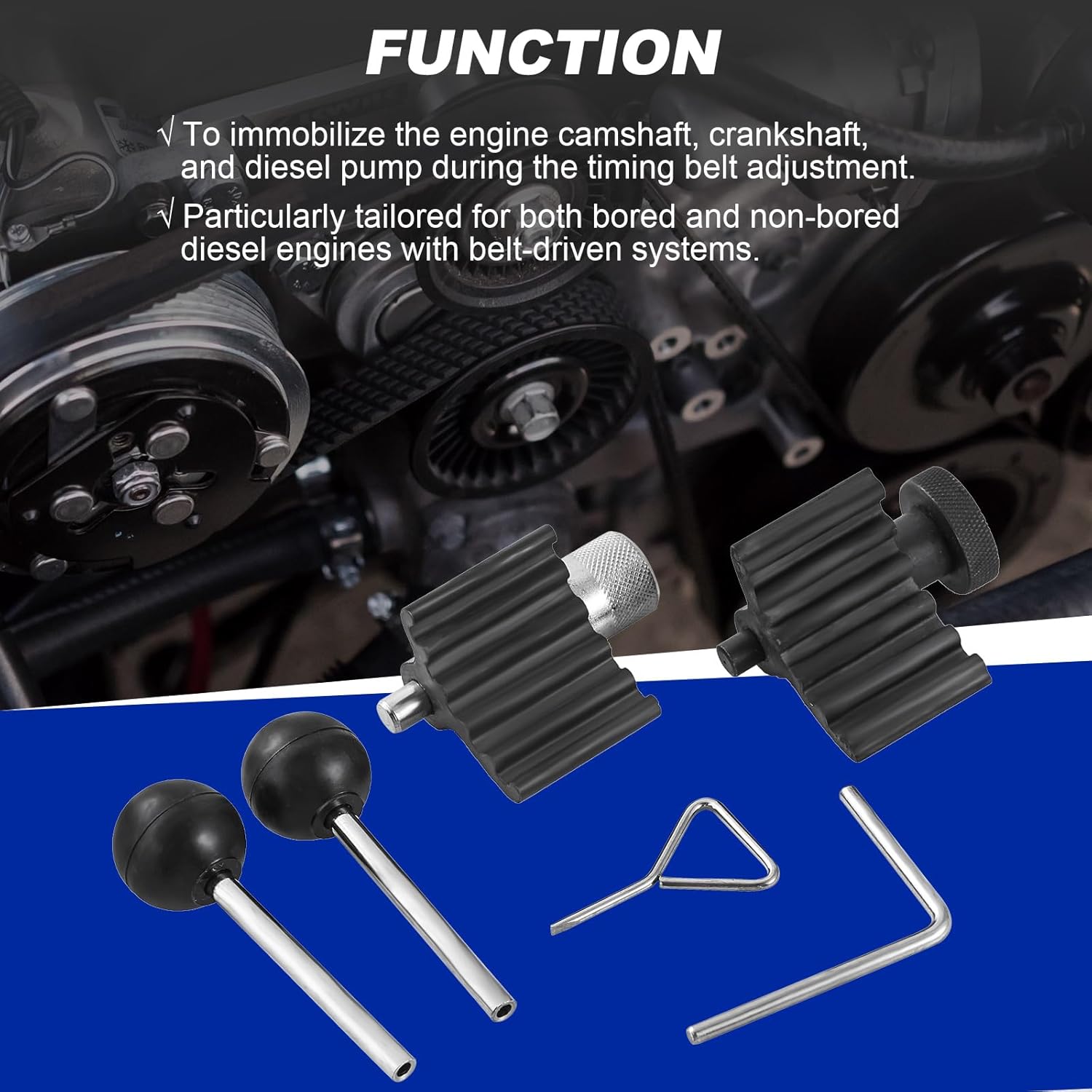 FUNCIÓN: Este kit de herramientas de alineación de tiempo sirve como una herramienta profesional diseñada para la instalación o eliminación de ejes de distribución/unidades de sincronización variable de eje de distribución de motores diesel. El juego de herramientas de bloqueo de tiempo de diesel facilita y hace efectiva la comprobación y ajuste de la sincronización del motor.