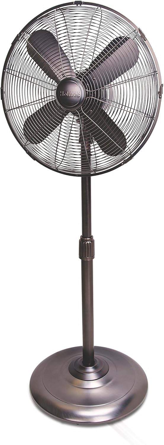 Quickly cool down a hot stuffy room with a refreshing breeze from the HOLMES Heritage 16-Inch stand fan. The stand-up fan features 16-Inch metal blades that provide quiet operation and the smooth oscillation is perfect for any bedroom or living room. Three speed settings let you customize your preferred comfort level and height and tilt adjustability help direct airflow throughout the room. It also features a sturdy weighted metal base.