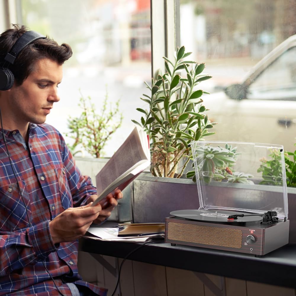 BELT-DRIVEN ANTI-VIBRATION SYSTEM - The turntable base is equipped with a spring and belt-driven design to provide shock absorption and improve sound quality. An easily removable dust cover protects your vinyl records from damage