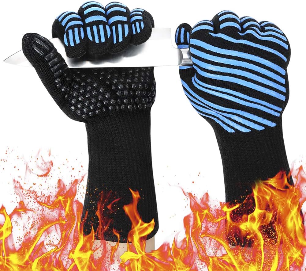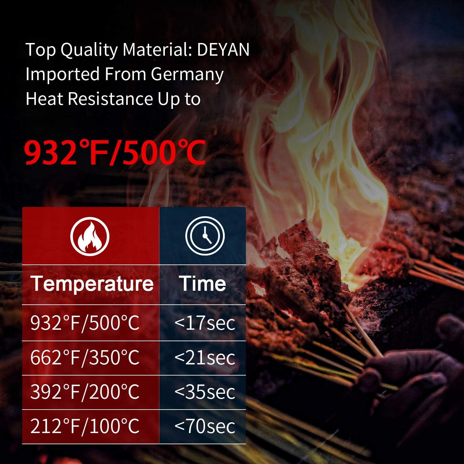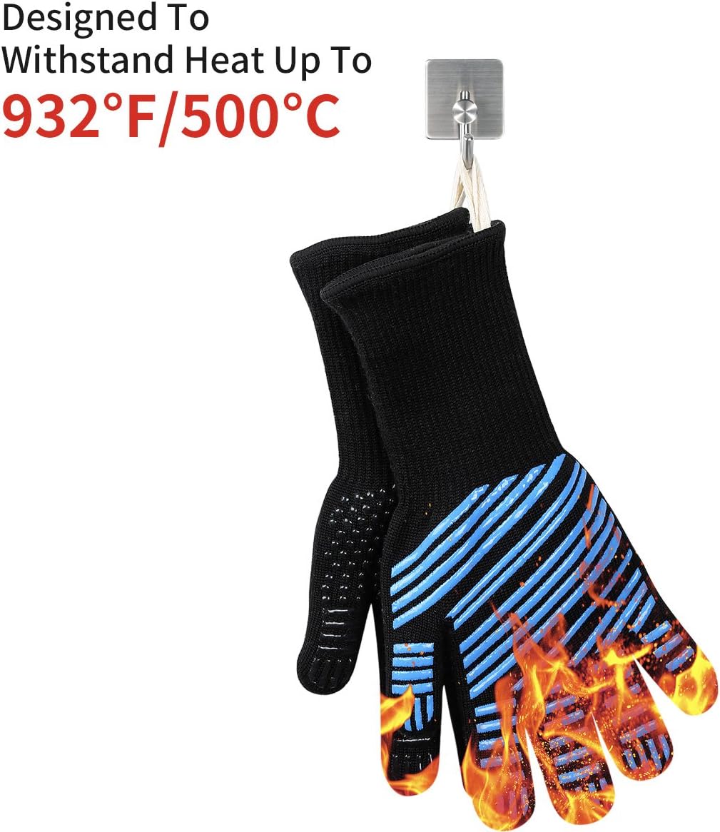 RESISTENTE AL CALOR EXTREMO Y A LAS LLAMAS Y A LOS CORTES - Nuestros guantes BBQ para asar pueden proporcionar de manera estable la ultra protección contra el calor hasta 932℉ (500℃), que también han recibido la más alta resistencia al corte EN388 - 4 veces más fuerte que el cuero. Ideal para asar, cortar, cocinar, hornear, trabajar en madera, soldar