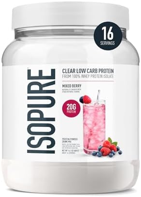 Isopure Clear Whey Isolate Protein Powder, Proteína en Polvo de Suero de Suero Libre de Lactosa, Libre de Gluten, Sabor Natural, Baya Mixta, 20g de Proteína por Porción, 14.1 Oz, 16 Porciones (El Empaque Puede Variar)