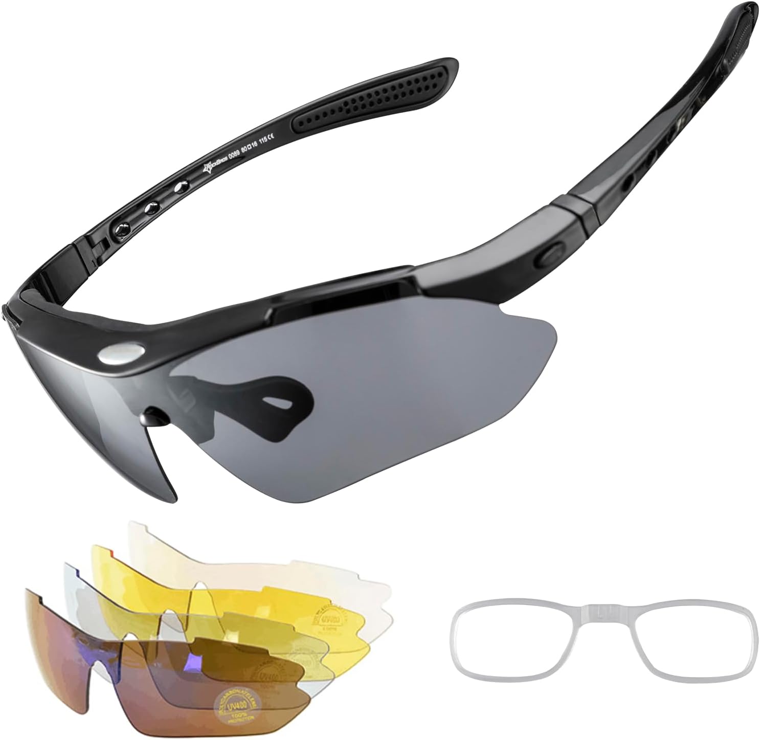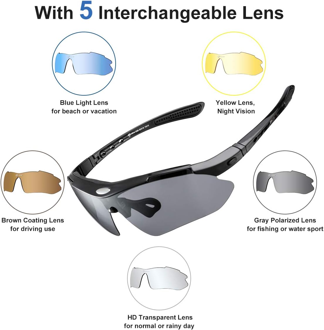 Cinco Lentes Intercambiables: 1 par de lentes polarizados y 4 pares de lentes originales intercambiables proporcionan más opciones de uso según diferentes actividades, las lentes polarizadas grises pueden usarse para montar, conducir, golf en un día de fuerte sol, la lente amarilla es para actividades nocturnas, las lentes transparentes anti-empañamiento están diseñadas para días nublados y lluviosos
