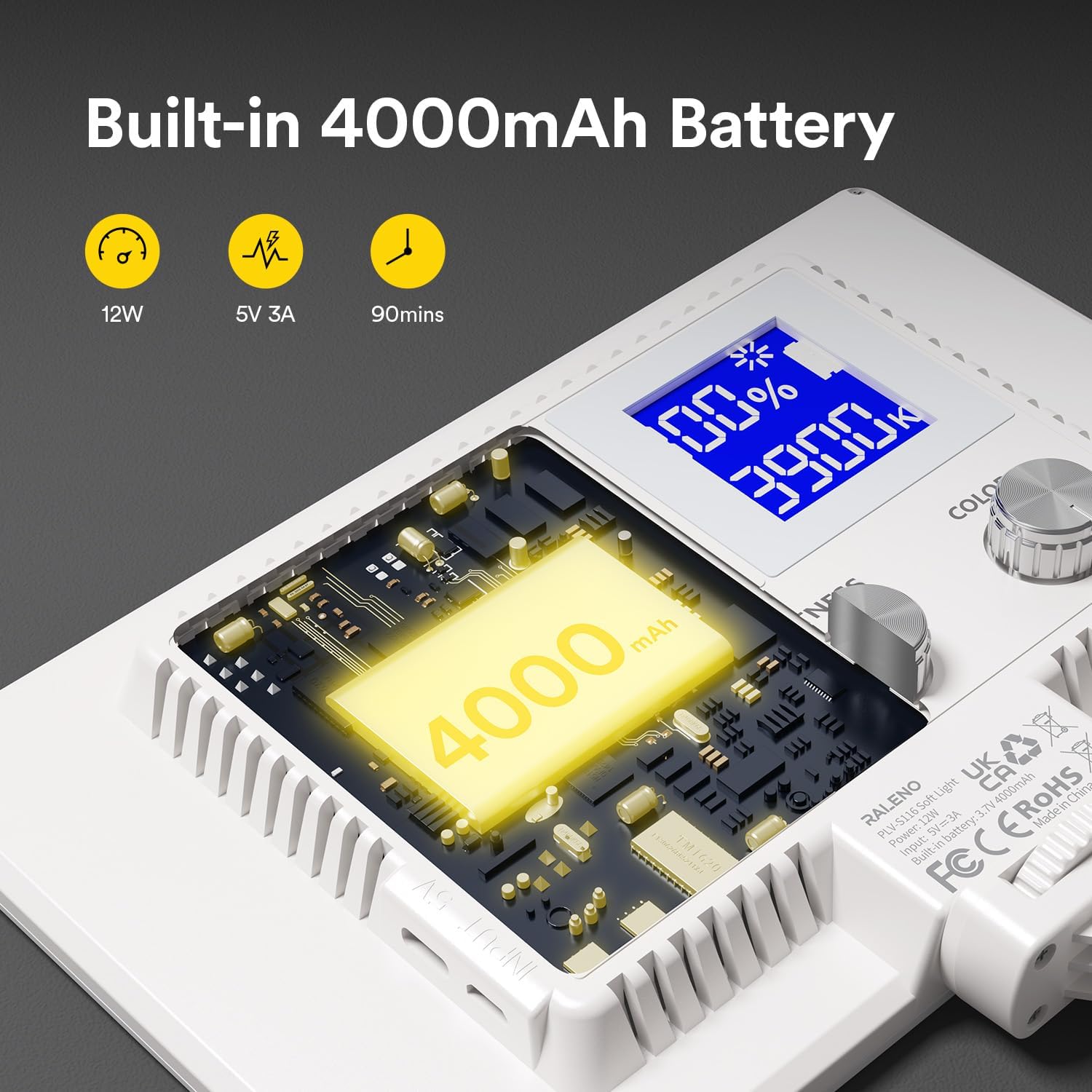 RALENO LED Video Light, White Camera Light for Pictures Video Recording with 4000mAh Battery Support Type-C USB Power Supply, CRI>95 3200K-5600K Photo Lights for Outdoor Photography Live Streaming