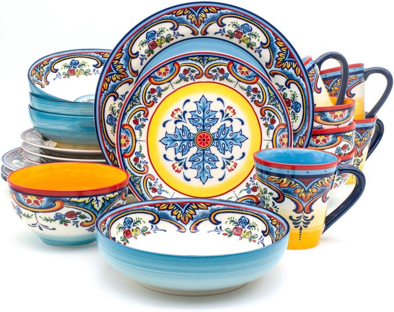 Do you want to elevate your dining experience? Are you tired of using dull, boring, and low-class dinnerware set? Do you want to host an unforgettable and sophisticated dinner with a completely safe and practical dinnerware set? Amaze your guests with Euro Ceramica Zanzibar Collection Vibrant 20 Piece Oven Safe Stoneware Dinnerware Set. Enhance your everyday dining experience with the grace and refinement of the Spanish Floral Design set conveniently recreated by the artisan design of the Zanzibar collection by Euro Ceramica. Now you can partake in classic Spanish beauty at every meal with this timeless dinnerware. In order to build the charm and value of the Zanzibar collection, No detail has been overlooked and every piece is hand-crafted. Experience Euro ceramic most beloved design Now expanded and in oven-safe stoneware! Richly designed, wonderfully colorful, and artisan-inspired, the Zanzibar dinnerware set reflects the unique characteristics of Southern Spain and will add an air of festive fun to your dinner table. Enjoy the benefits of our new included dining bowls for efficient meal times and dine with confidence and impress at your next dinner party. Zanzibar stoneware is oven safe up to 400F, as well as dishwasher and microwave safe. Set includes: ✅4 dinner plates (10. 94 x 10. 94 x 1. 18) ✅4 salad plates (8. 66 x 8. 66 x 0. 94), ✅4 cereal bowls (5. 67 x 5. 67 x 3. 07) ✅4 mugs (5. 51 x 4. 06 x 4. 17) ✅4 dining bowls (8. 19 x 8. 19 x 2. 24) We believe your home should be a collection of things you love so were here to help you bring a few more of those things to your home. We strive to help you fill your home with uniquely crafted pieces that will make your home that much more curated and your gatherings more beautiful. Unique Features: ✅Bright and Eye-Catching Color Scheme ✅Decorate your Entire Kitchen: Wide Variety of Accessories Available ✅Truly One-of-a-Kind Design Inspired by Personal Travels around South of Spain ✅The perfect shade of blue paired with warm yellows in a design destined to match every home ✅Casual enough for every day, but also unexpected enough to wow any guest Buy With Confidence! Add to cart NOW! Product Dimension: Width: 12.80 X Height: 13.00 X Depth: 23.40 Inches