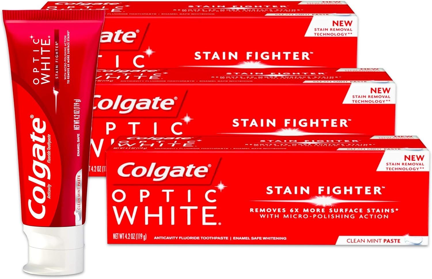 Colgate Optic White Anticavity Fluoride Toothpaste In Stain Fighter Clean Mint Paste (Net Wt. 4.2 oz. Per Tube). Pack of 3 Tubes Per Quantity Ordered (Total of 12.6 oz.). Stain Fighter - Removes 6X More Surface Stains With Micro-Polishing Action. Clean Mint Paste - Enamel Safe Whitening.